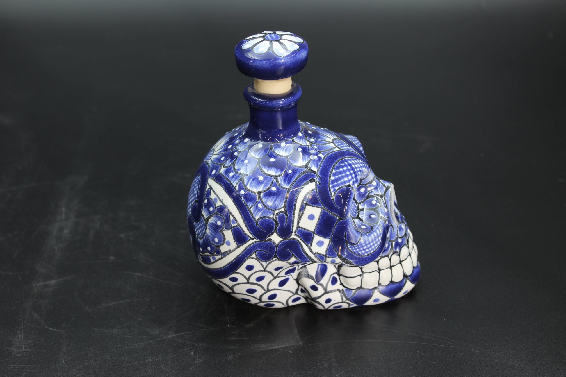 16oz Blue Talavera Ceramic Skull Liquor Bottle