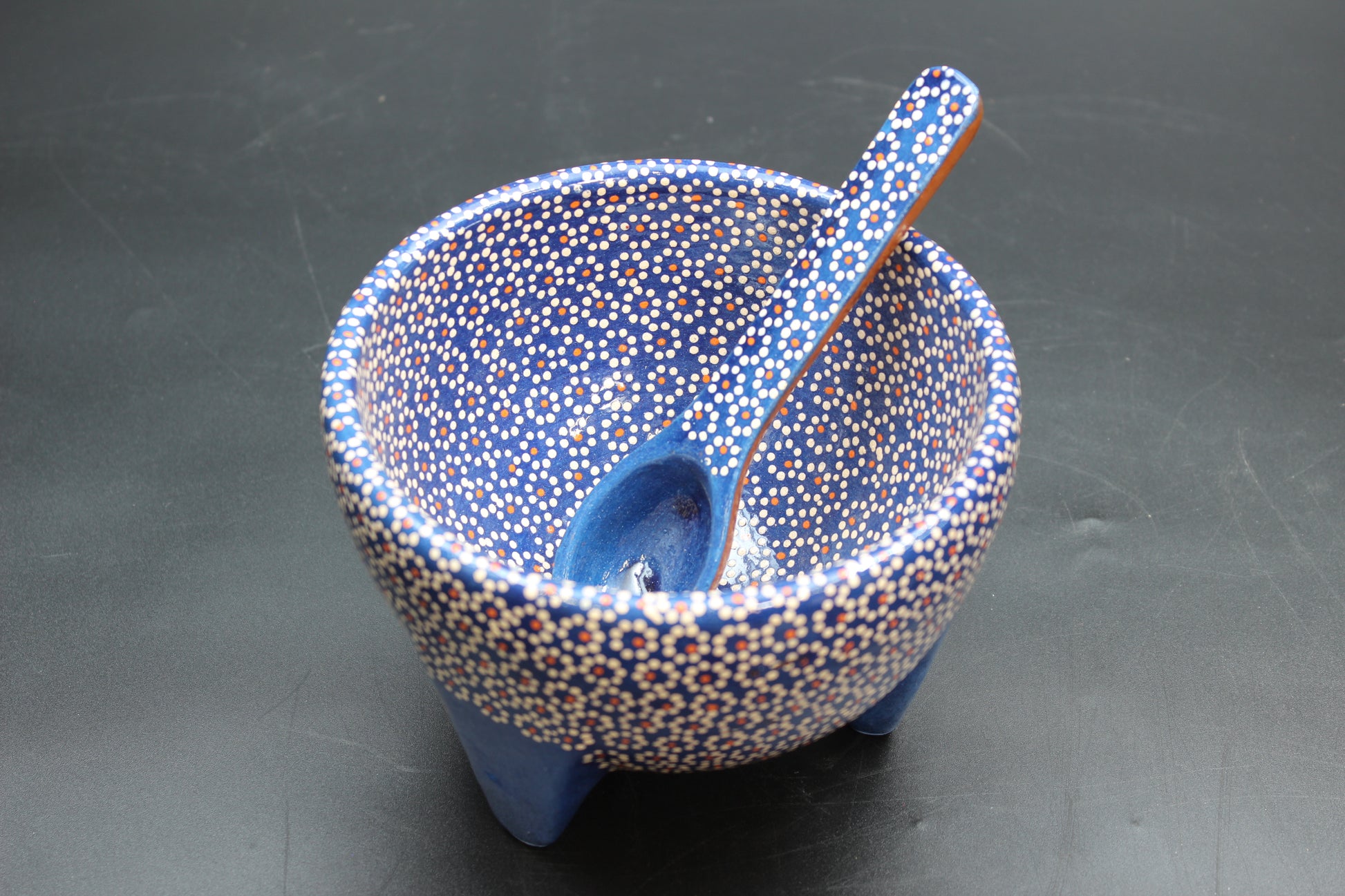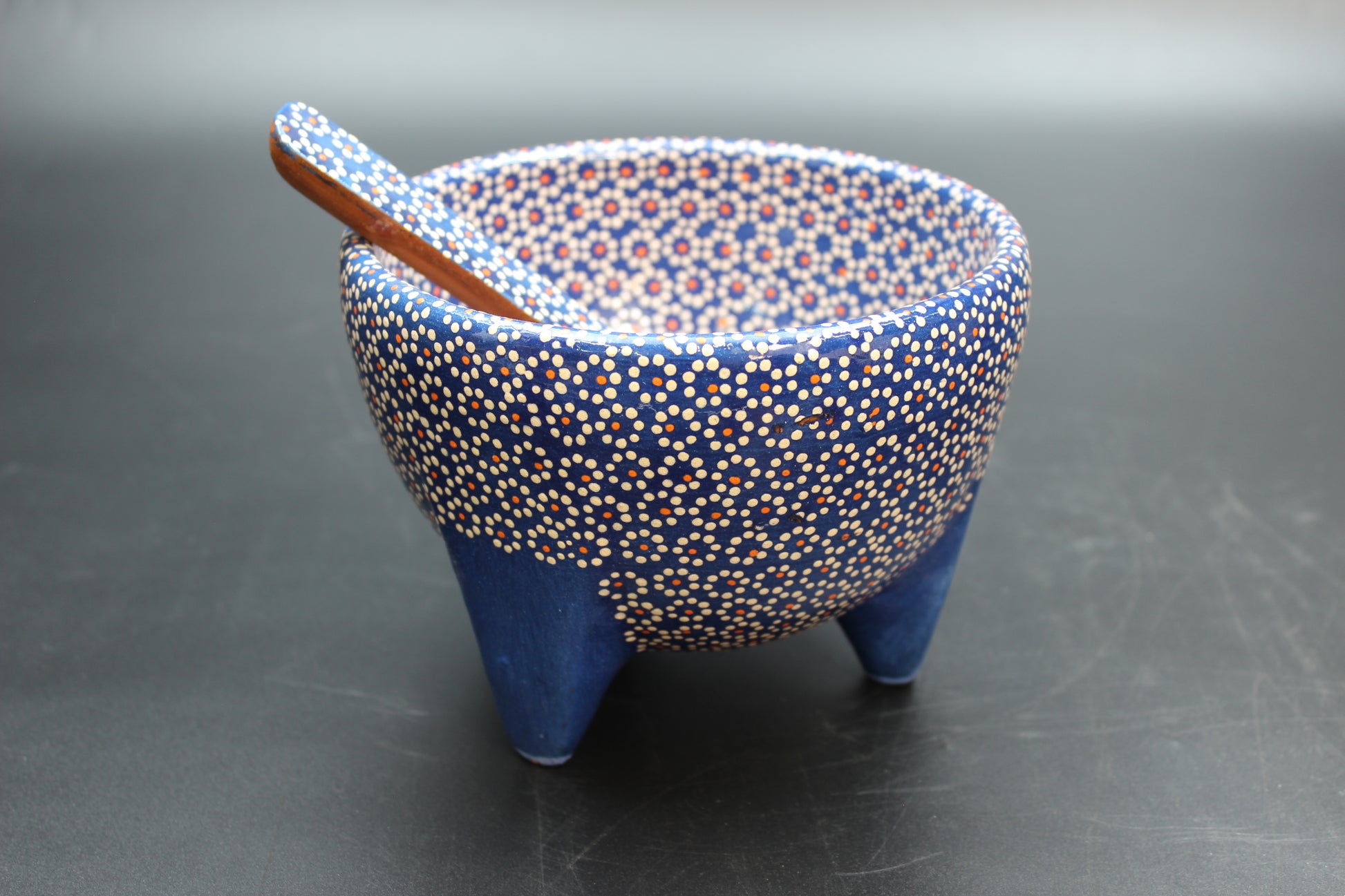 Beautiful royal blue, clay ceramic molcajete bowl with spoon. 6oz volume.