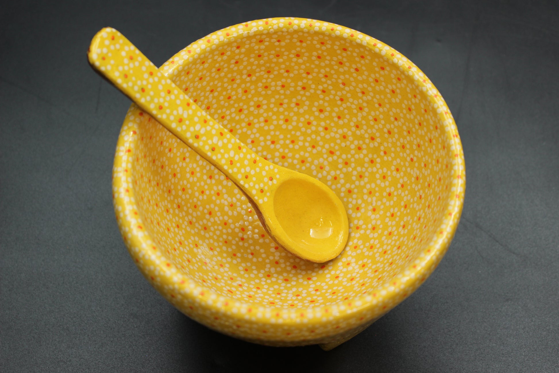 Beautiful saffron yellow, clay ceramic molcajete bowl with spoon. 6oz volume.