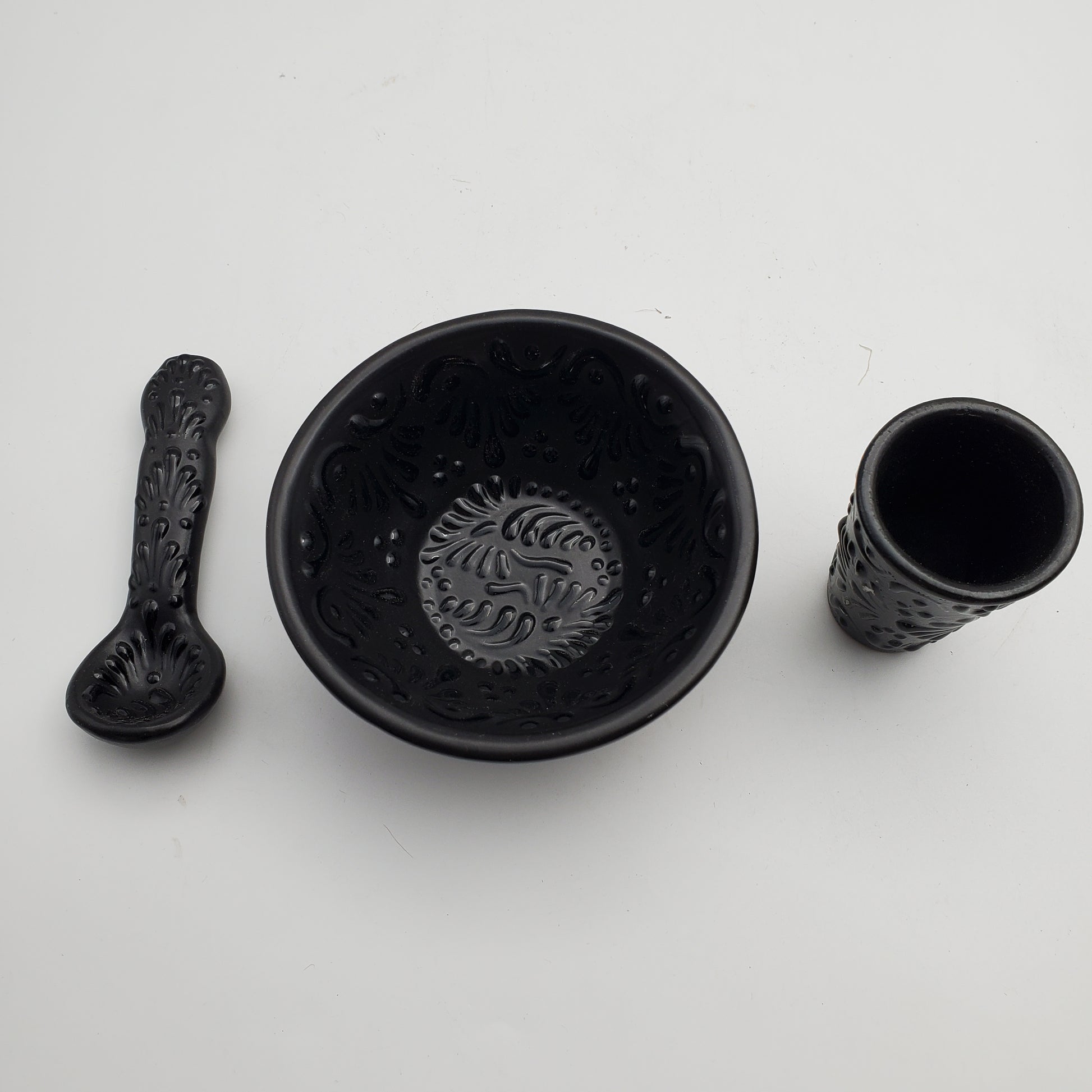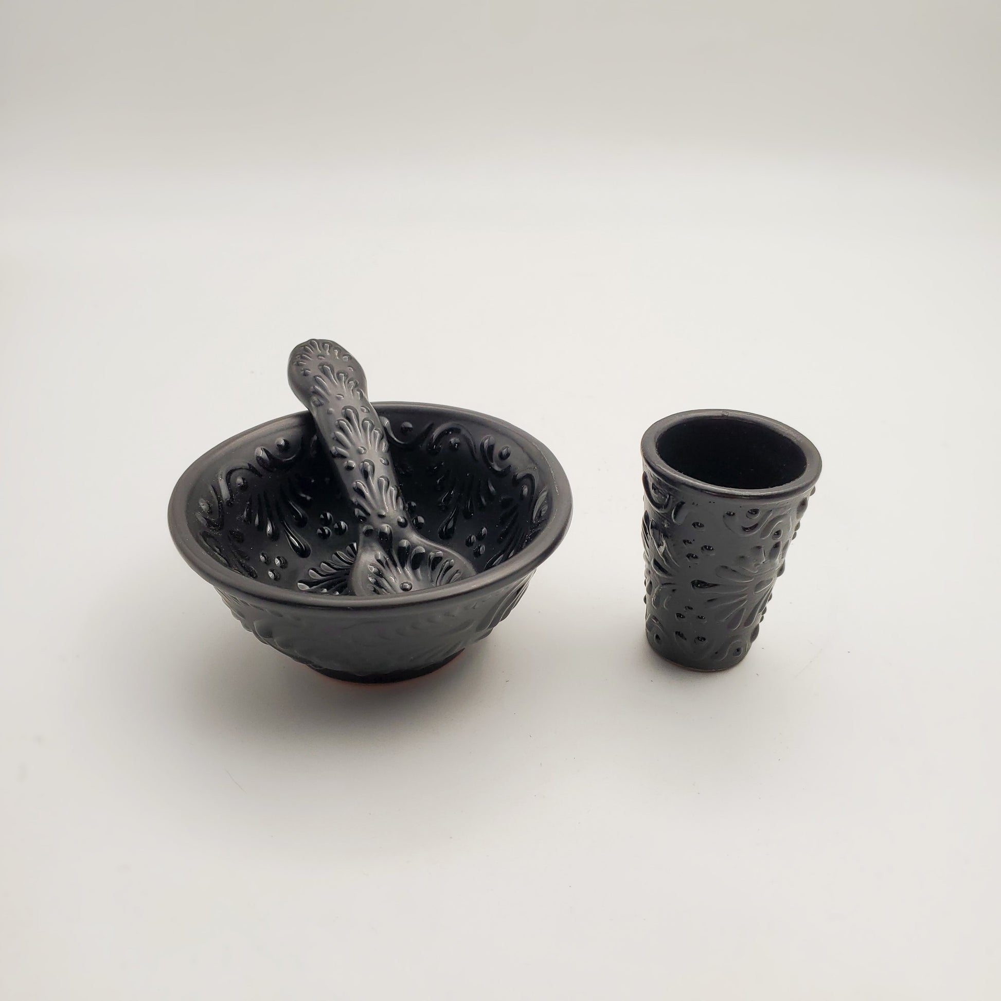 Beautiful black handcrafted tequila and serving set made from Mexican Talavera. Known for its good artisan quality, Mexican Talavera ceramic products are part of the best of the world. Thanks to centuries of a huge cultural swap coming all the way from the Arabian peninsula, and then passing through the Iberic peninsula, Mexican Talavera artists have perfected and achieved a unique method that yields some fascinating and beautiful designs that will elevate the perception of your home.