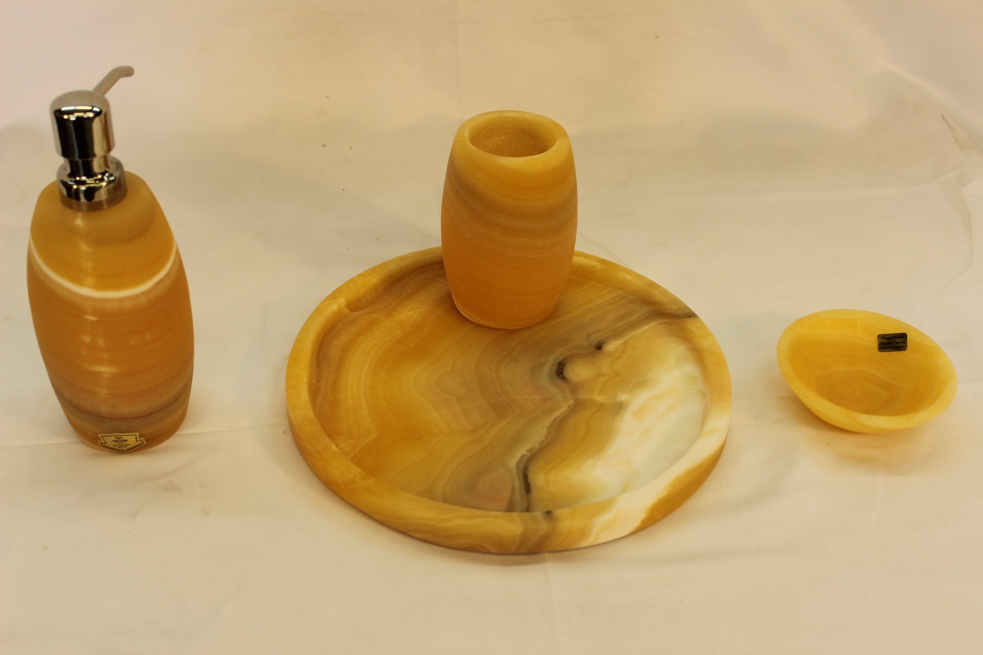 Orange and white handcrafted onyx bath accessory set. This precious stone has been carefully crafted for millions of years by the artisans that are our Mexican volcanoes. Each piece is unique in its nature- no extracted stone is the same as another. Our Mexican artists make sure to pick the most beautiful samples from our volcanic deposits, and craft astonishing pieces of art.