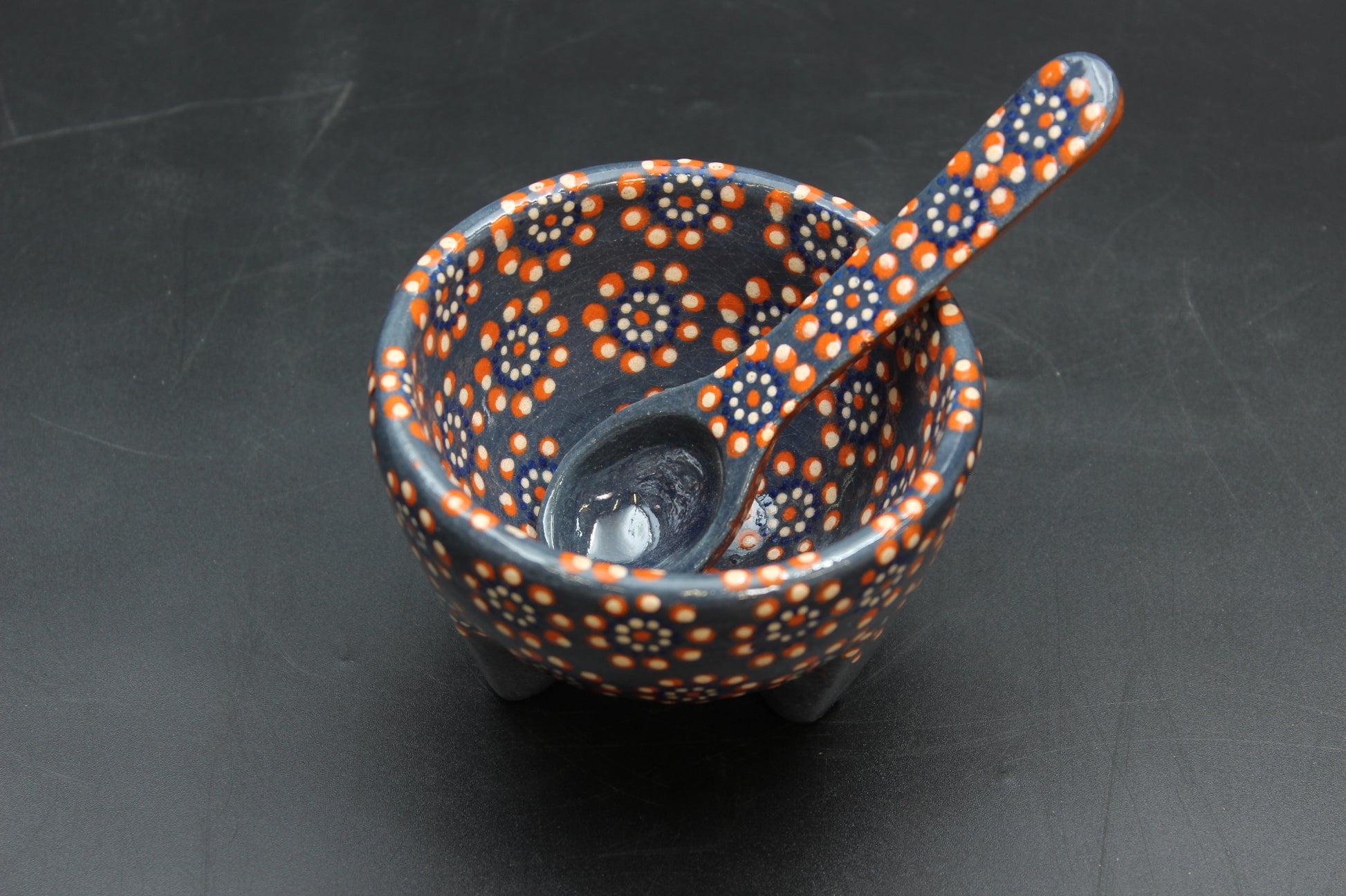 Beautiful blue & red clay ceramic molcajete bowl with spoon. 6oz volume.