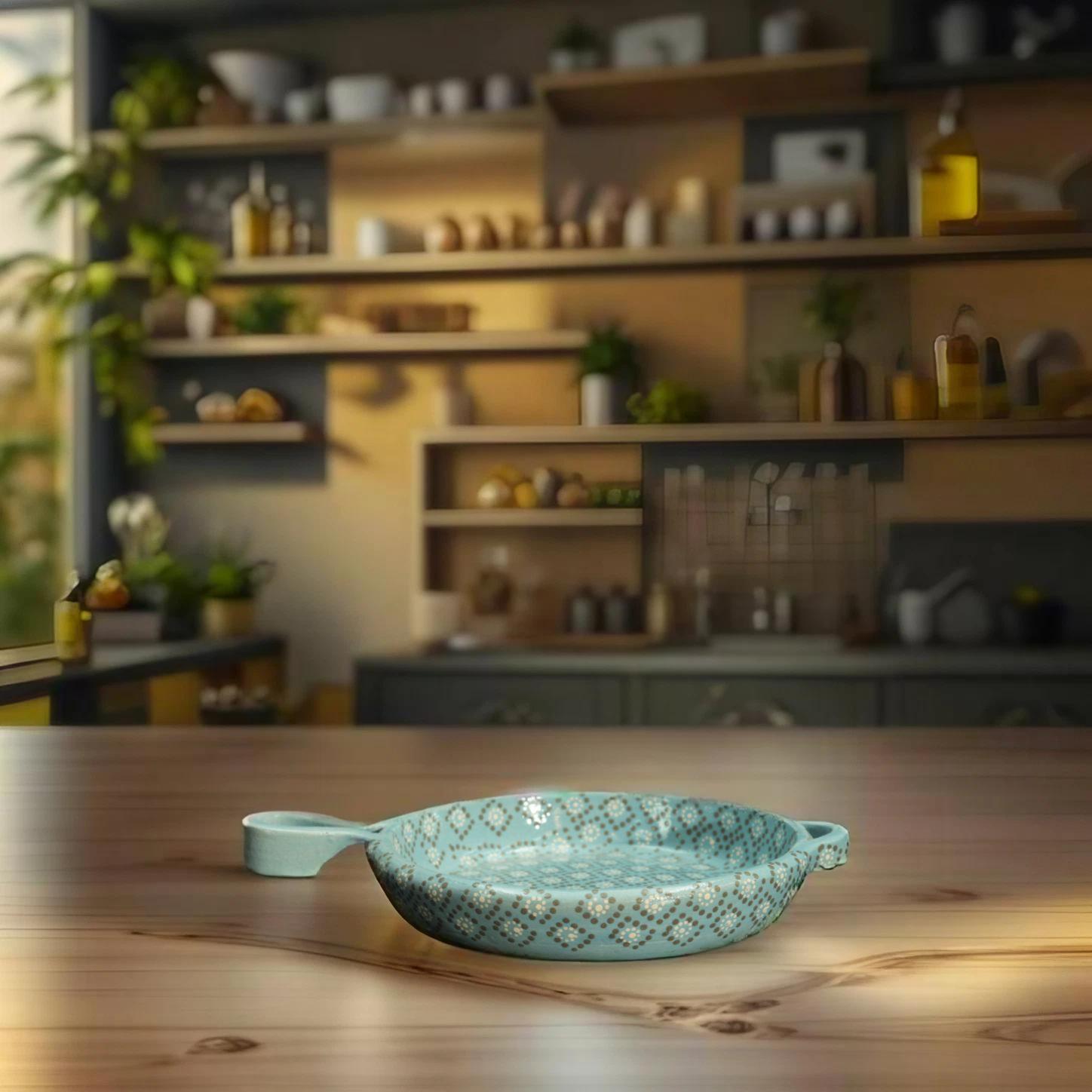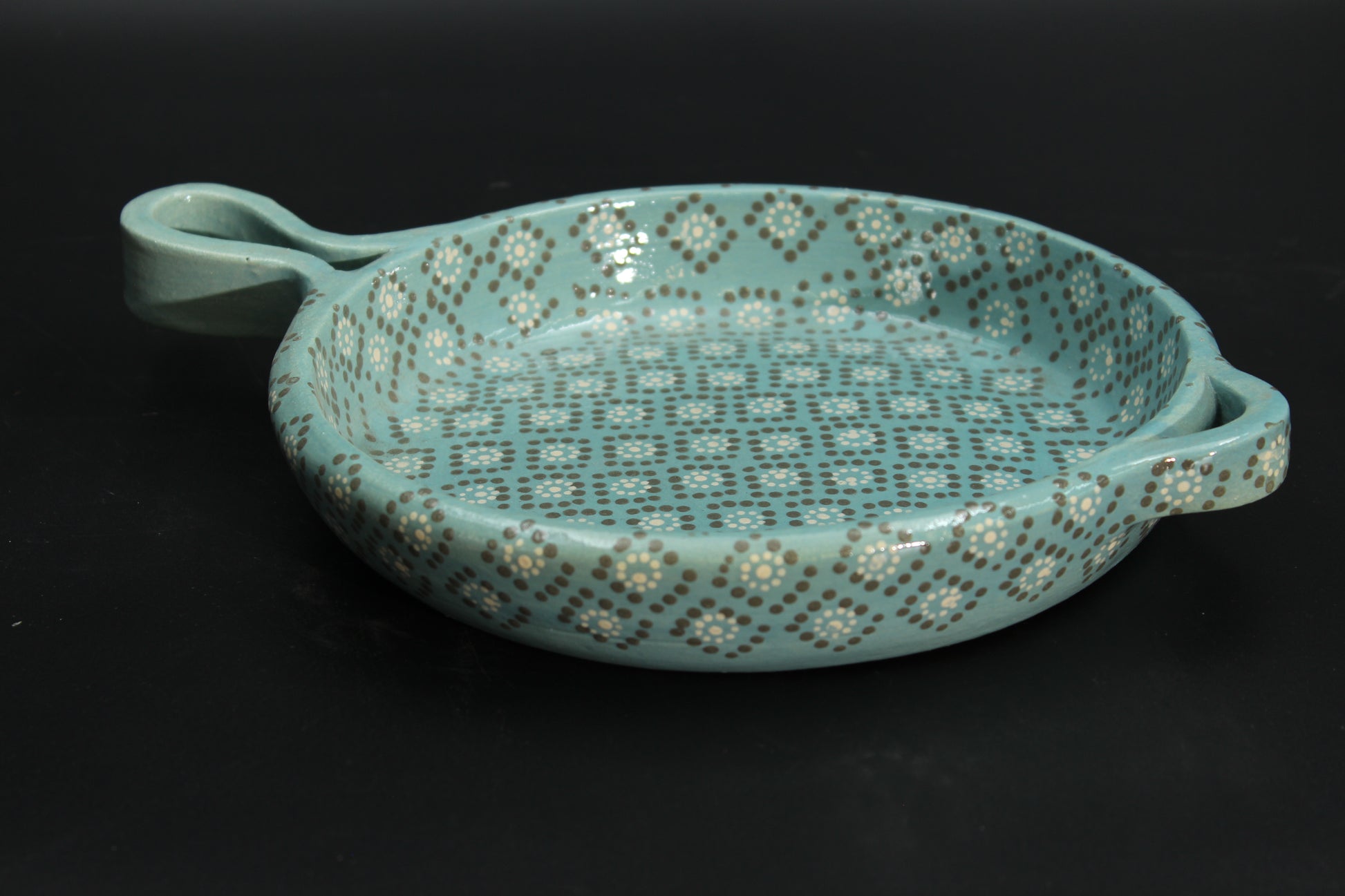 Beautiful aqua-patterned, handcrafted, clay-ceramic frying pan. Known for its good artisan quality, Mexican ceramic products are some of the best in the world. Thanks to centuries of cultural exchange coming all the way from the Arabian peninsula, and then passing through the Iberic peninsula, Mexican ceramic artists have perfected and achieved a unique method that yields exquisite designs that will elevate the perception of your home.