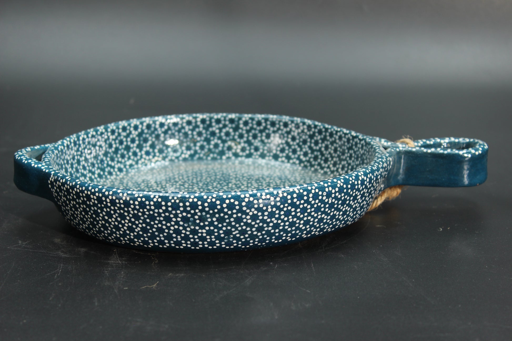 Beautiful blue-patterned, handcrafted, clay-ceramic frying pan. Known for its good artisan quality, Mexican ceramic products are some of the best in the world. Thanks to centuries of cultural exchange coming all the way from the Arabian peninsula, and then passing through the Iberic peninsula, Mexican ceramic artists have perfected and achieved a unique method that yields exquisite designs that will elevate the perception of your home.