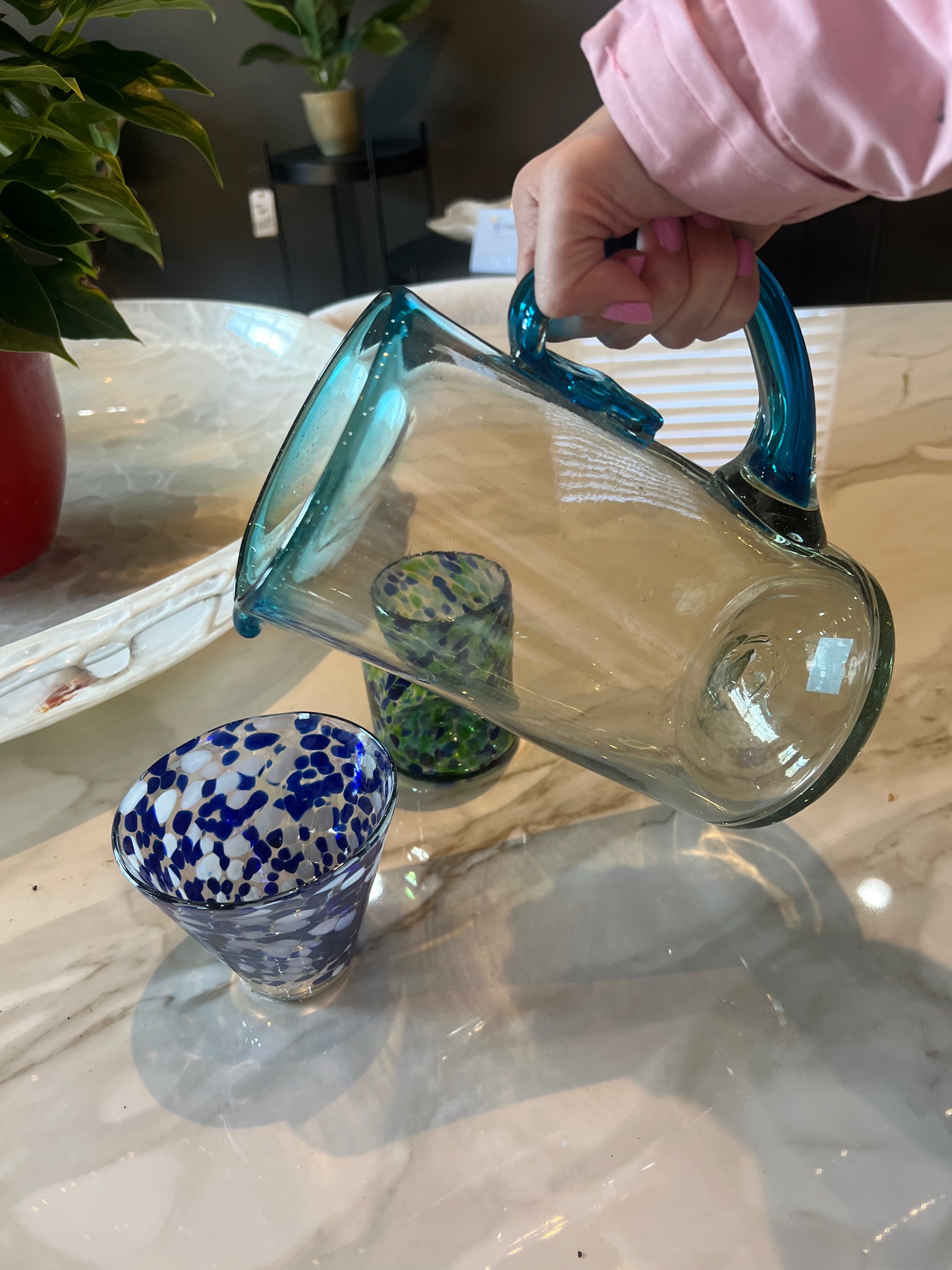 Beautiful aqua blue pitcher made out of blown glass. Only compared with the Italian blown glass techniques from Murano, the blown glass quality from Tlaquepaque in Mexico is from the best of its kind in the world. Every artist has dedicated their lifetime to master this technique, and as a result of generations of perfectioning said technique, the artists produce some of the best blown glass pieces in the world.