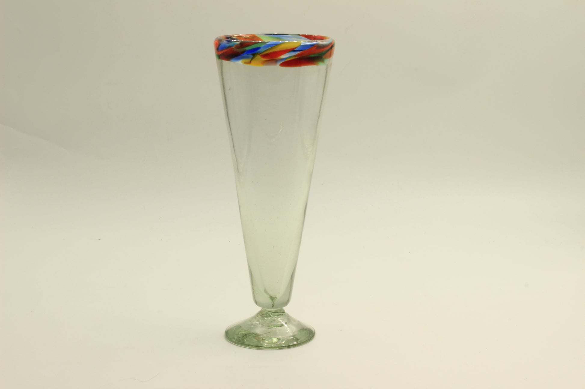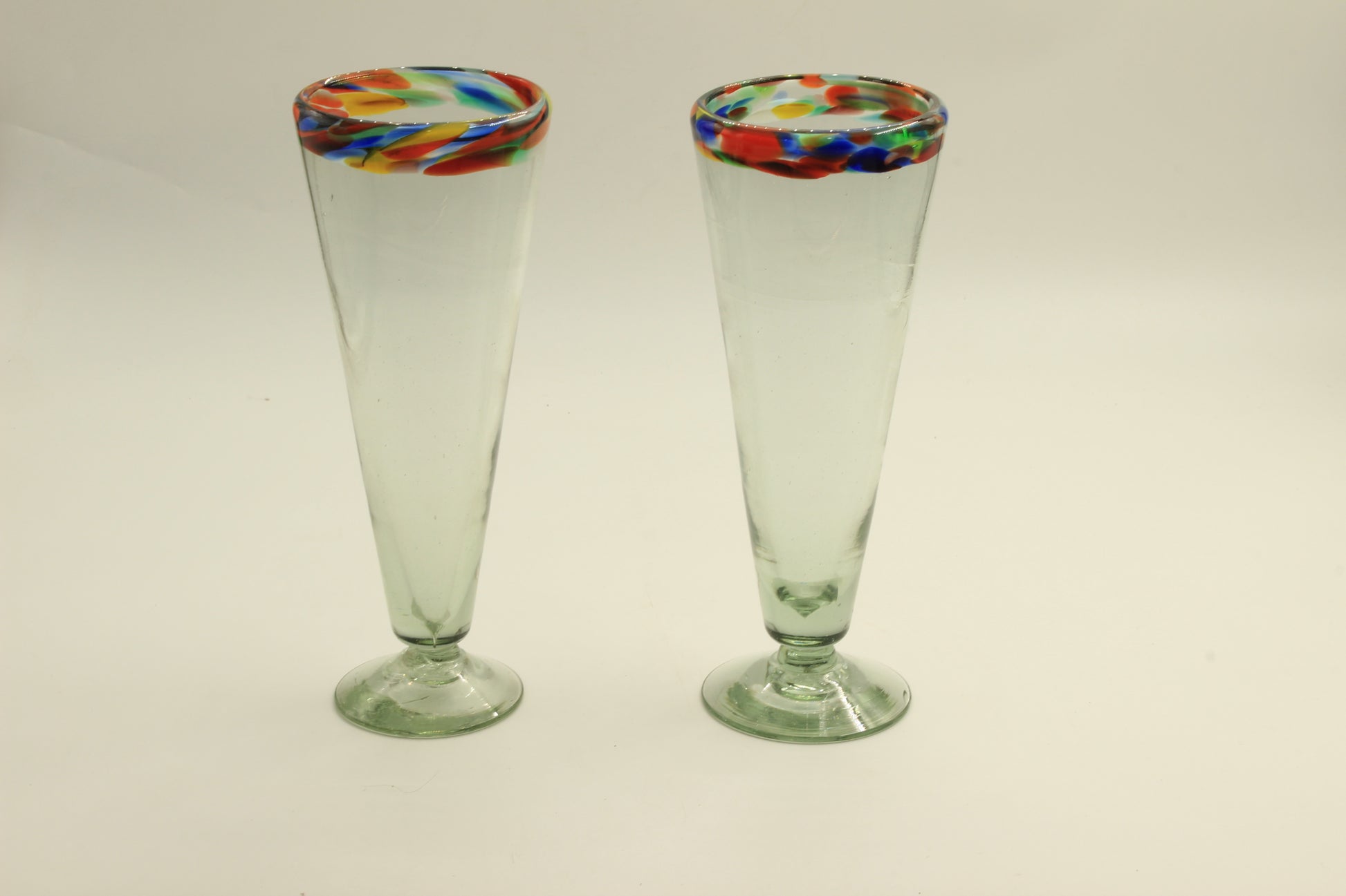 Beautiful multicolor and transparent beer blown glass set. Only compared with the Italian blown glass techniques from Murano, the blown glass quality from Tlaquepaque in Mexico is from the best of its kind in the world. Every artist has dedicated their lifetime to master this technique, and as a result of generations of perfectioning said technique, the artists produce some of the best blown glass pieces in the world.