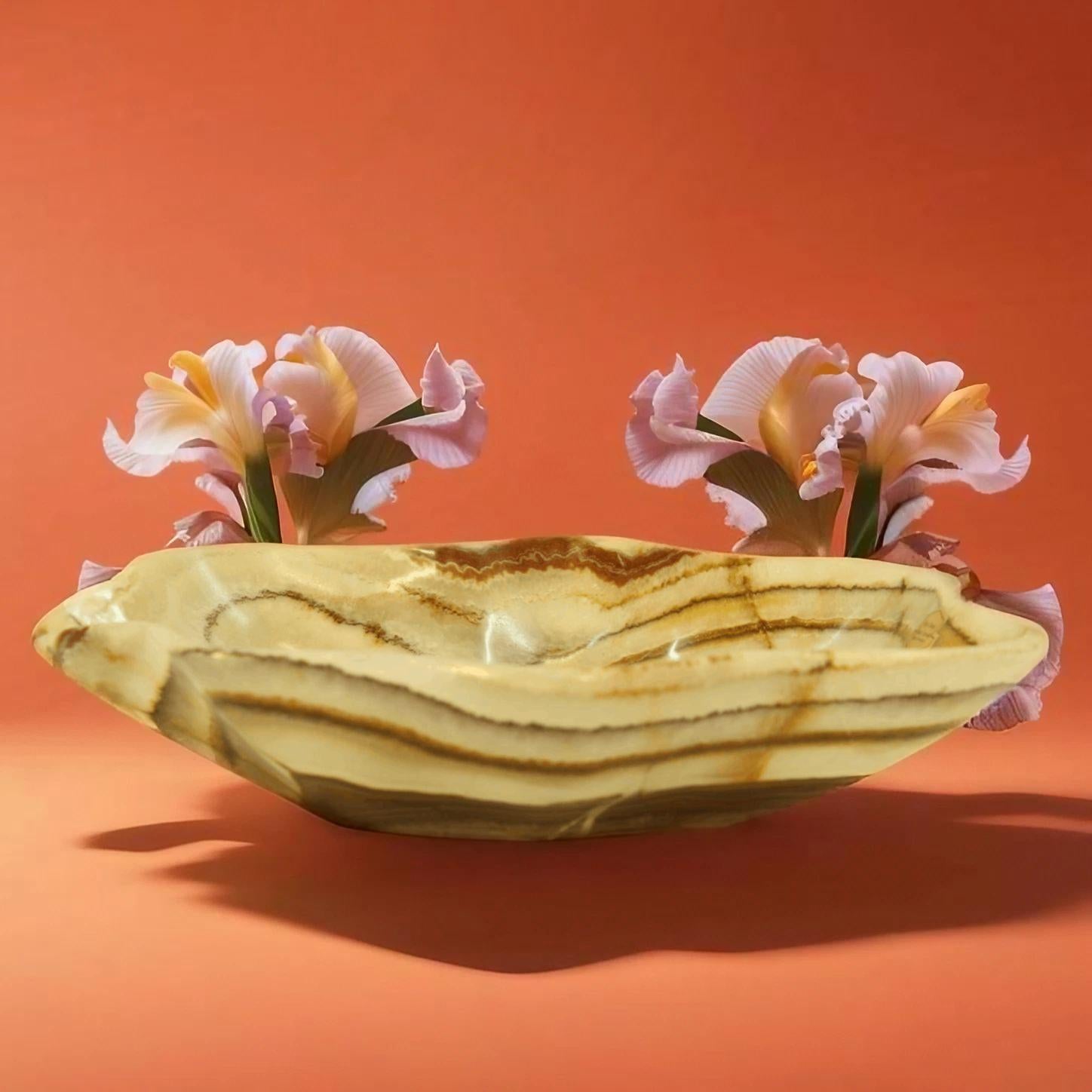 Beige, brown, and black handcrafted onyx centerpiece. This precious stone has been carefully crafted for millions of years by the artisans that are our Mexican volcanoes. Each piece is unique in its nature. No extracted stone is the same as another. Our Mexican artists make sure to pick the most beautiful samples from our volcanic deposits, and therefore craft astonishing pieces of art.