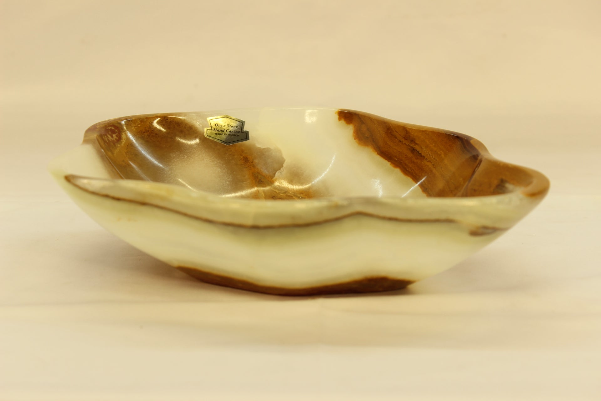 Beige, brown, and black handcrafted onyx centerpiece. This precious stone has been carefully crafted for millions of years by the artisans that are our Mexican volcanoes. Each piece is unique in its nature. No extracted stone is the same as another. Our Mexican artists make sure to pick the most beautiful samples from our volcanic deposits, and therefore craft astonishing pieces of art.