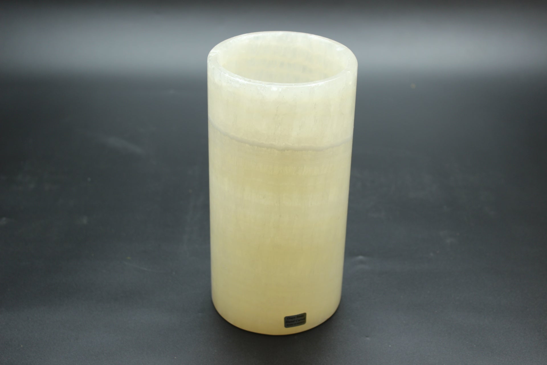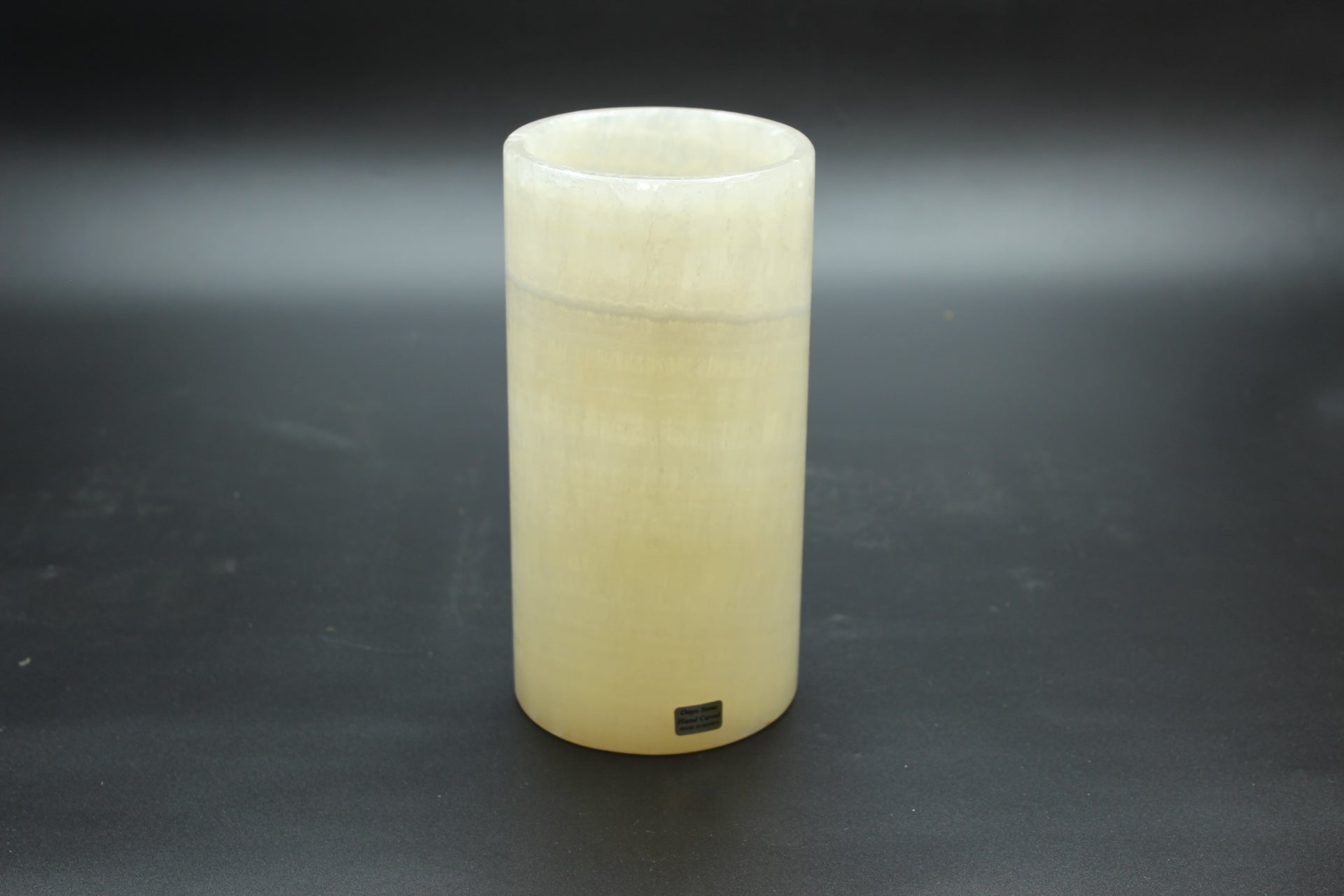Beige and white handcrafted onyx vase. This precious stone has been carefully crafted for millions of years by the artisans that are our Mexican volcanoes. Each piece is unique in its nature. No extracted stone is the same as another. Our Mexican artists make sure to pick the most beautiful samples from our volcanic deposits, and therefore craft astonishing pieces of art.