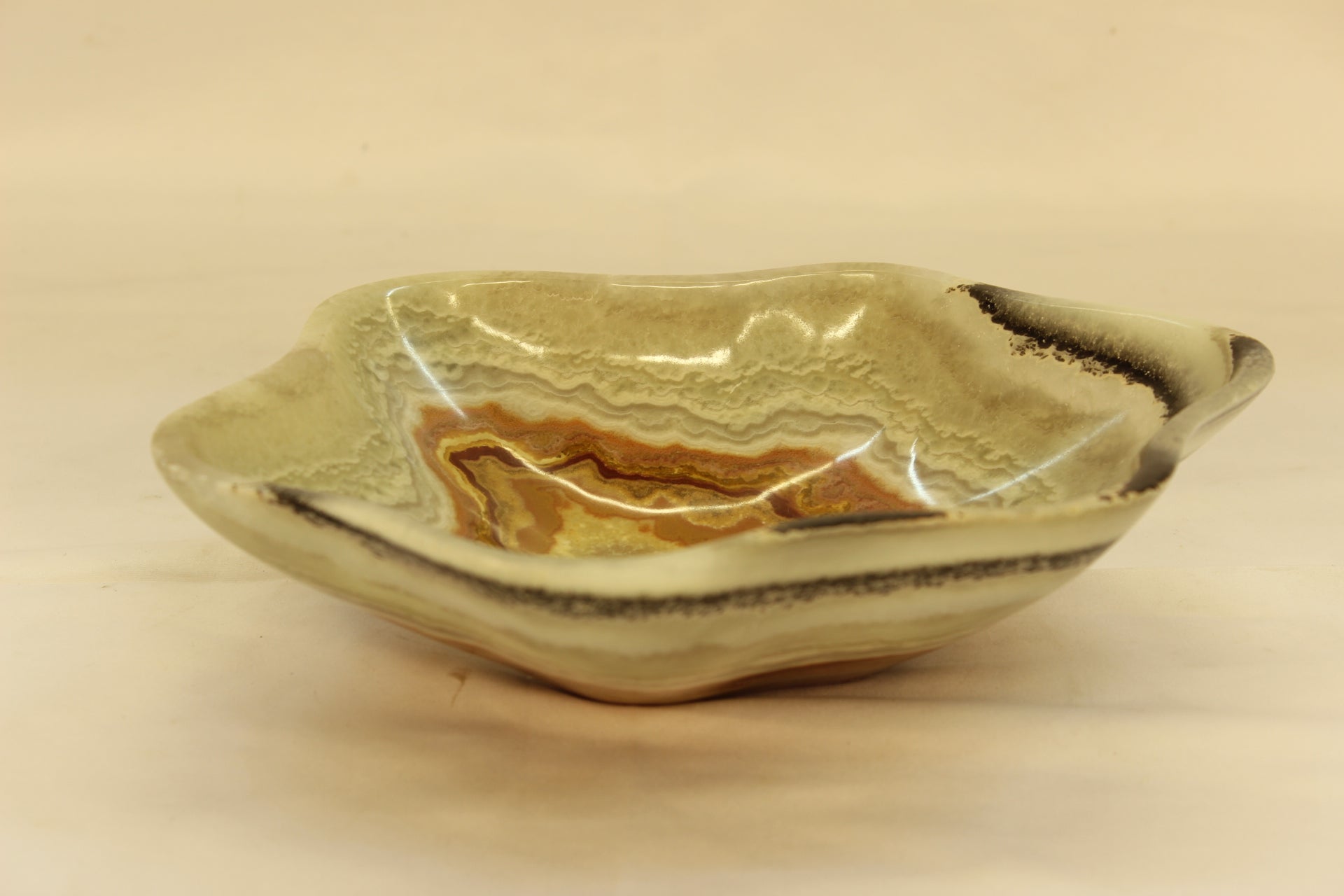 Beige, black and beige handcrafted onyx centerpiece. This precious stone has been carefully crafted for millions of years by the artisans that are our Mexican volcanoes. Each piece is unique in its nature. No extracted stone is the same as another. Our Mexican artists make sure to pick the most beautiful samples from our volcanic deposits, and therefore craft astonishing pieces of art.