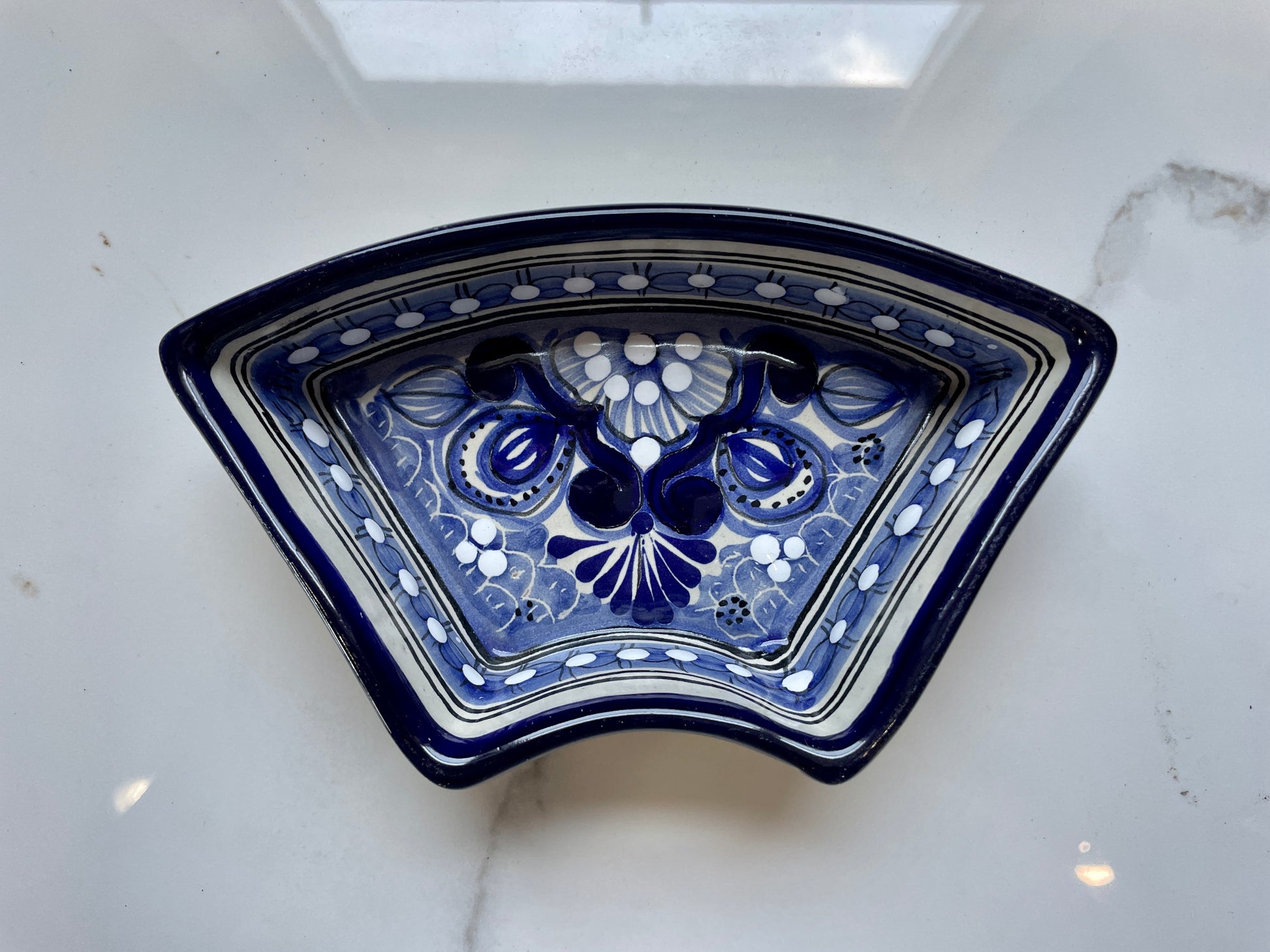 Beautiful blue and white handcrafted dipping tray set made from Mexican Talavera. Known for its good artisan quality, Mexican Talavera ceramic products are part of the best of the world. Thanks to centuries of a huge cultural swap coming all the way from the Arabian peninsula, and then passing through the Iberic peninsula, Mexican Talavera artists have perfected and achieved a unique method that yields some fascinating and beautiful designs that will elevate the perception of your home.