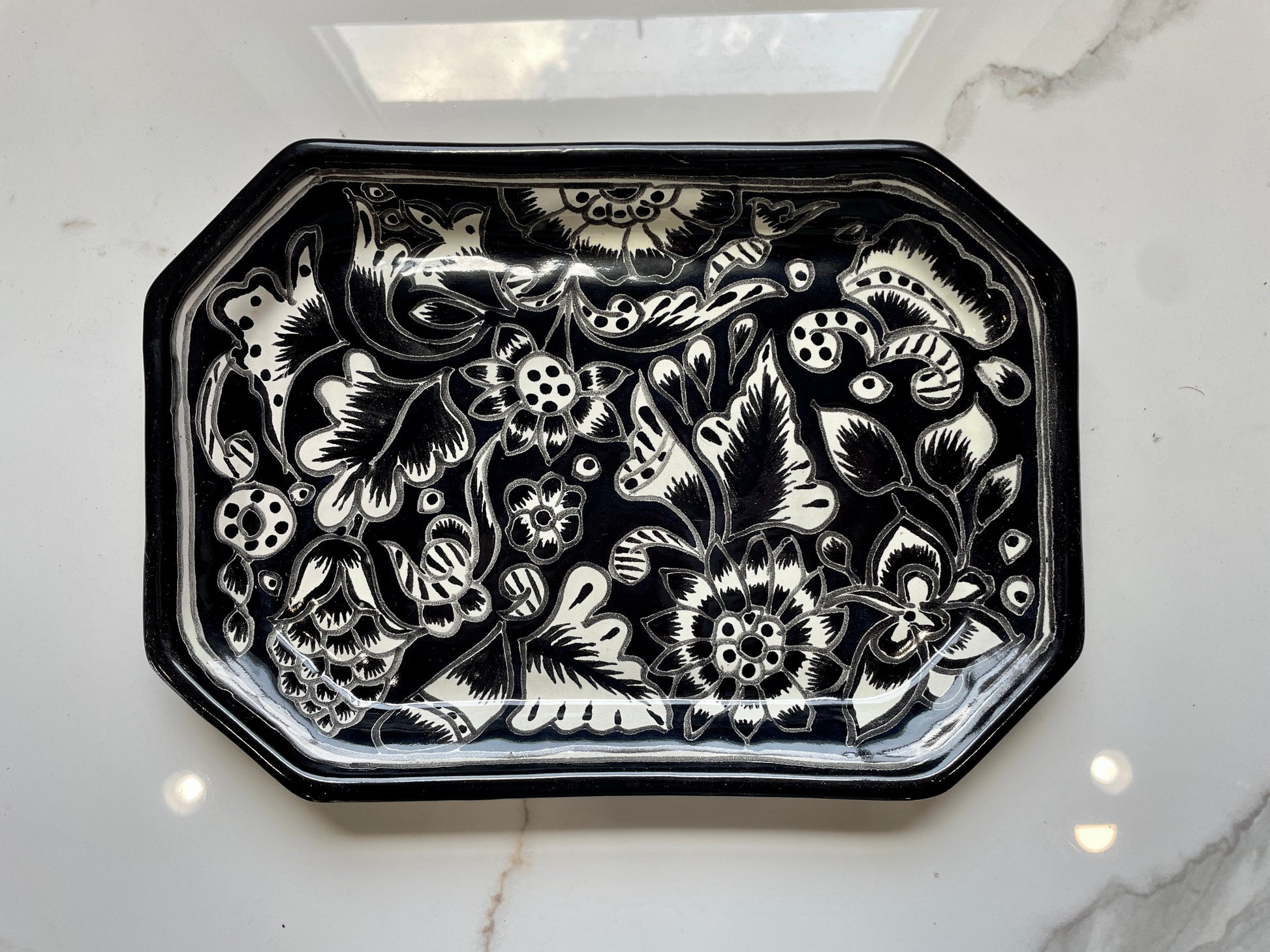 Beautiful black and white handcrafted and patterned tray made from Mexican Talavera. Known for its good artisan quality, Mexican Talavera ceramic products are part of the best of the world. Thanks to centuries of a huge cultural swap coming all the way from the Arabian peninsula, and then passing through the Iberic peninsula, Mexican Talavera artists have perfected and achieved a unique method that yields some fascinating and beautiful designs that will elevate the perception of your home.