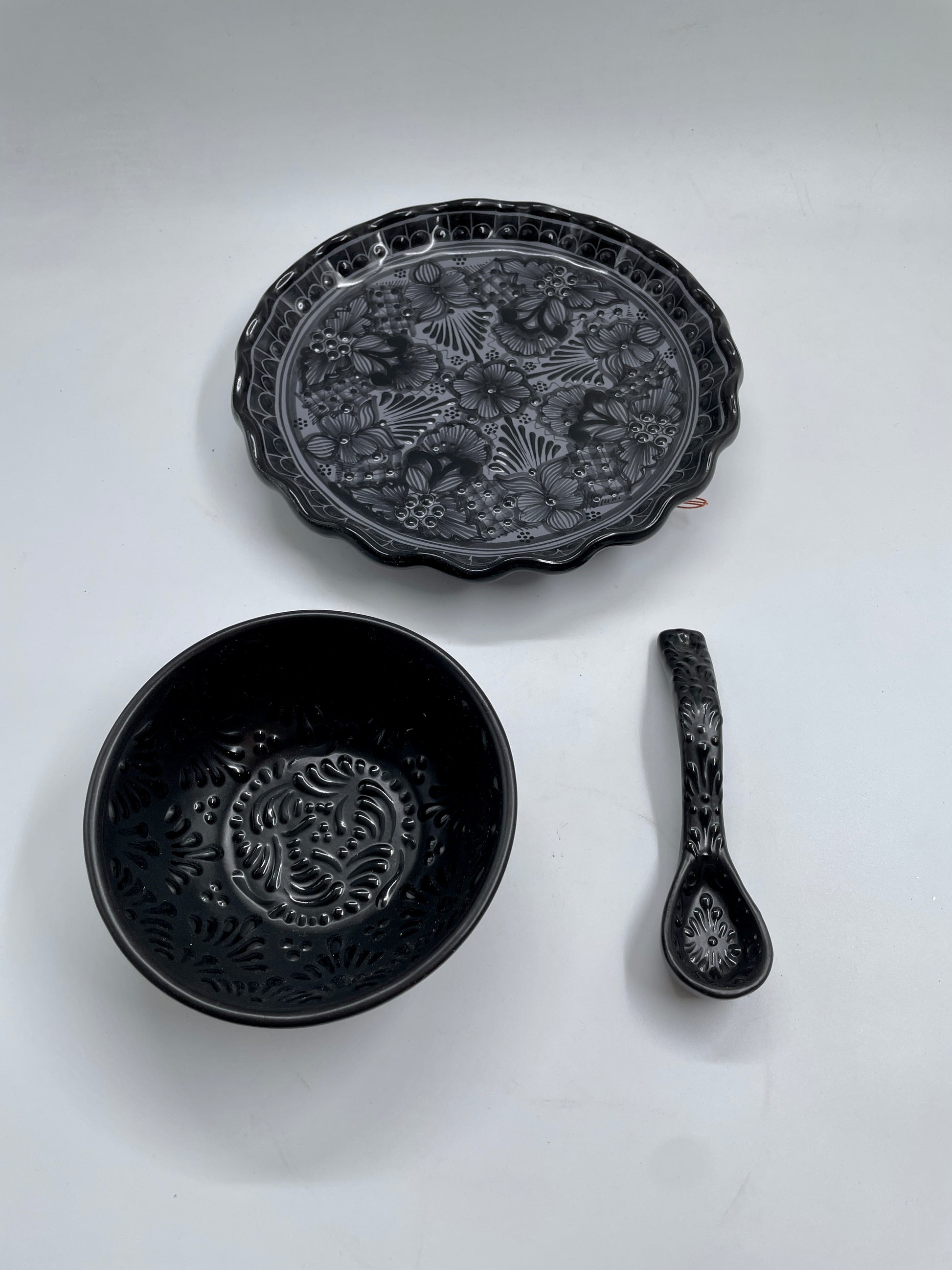 Beautiful black handcrafted and patterned bowl set made from Mexican Talavera. Known for its good artisan quality, Mexican Talavera ceramic products are part of the best of the world. Thanks to centuries of a huge cultural swap coming all the way from the Arabian peninsula, and then passing through the Iberic peninsula, Mexican Talavera artists have perfected and achieved a unique method that yields some fascinating and beautiful designs that will elevate the perception of your home.