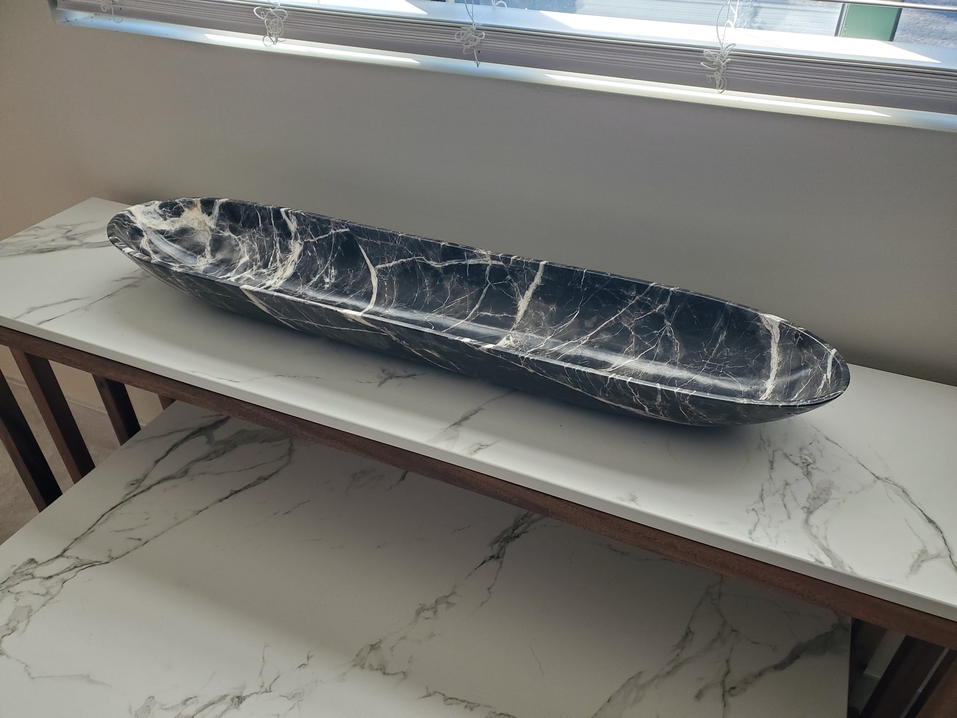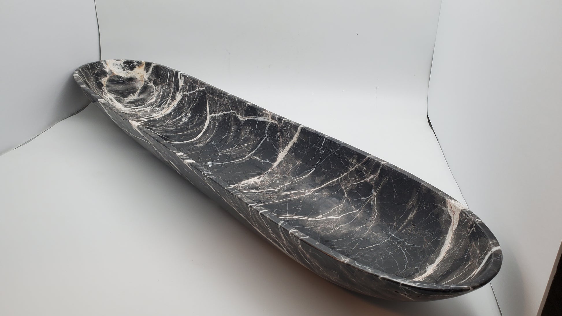 Black and White handcrafted canoe marble centerpiece. This precious stone has been carefully crafted for millions of years by the artisans that are our Mexican volcanoes. Each piece is unique in its nature. No extracted stone is the same as another. Our Mexican artists make sure to pick the most beautiful samples from our volcanic deposits, and therefore craft beautiful pieces of art.