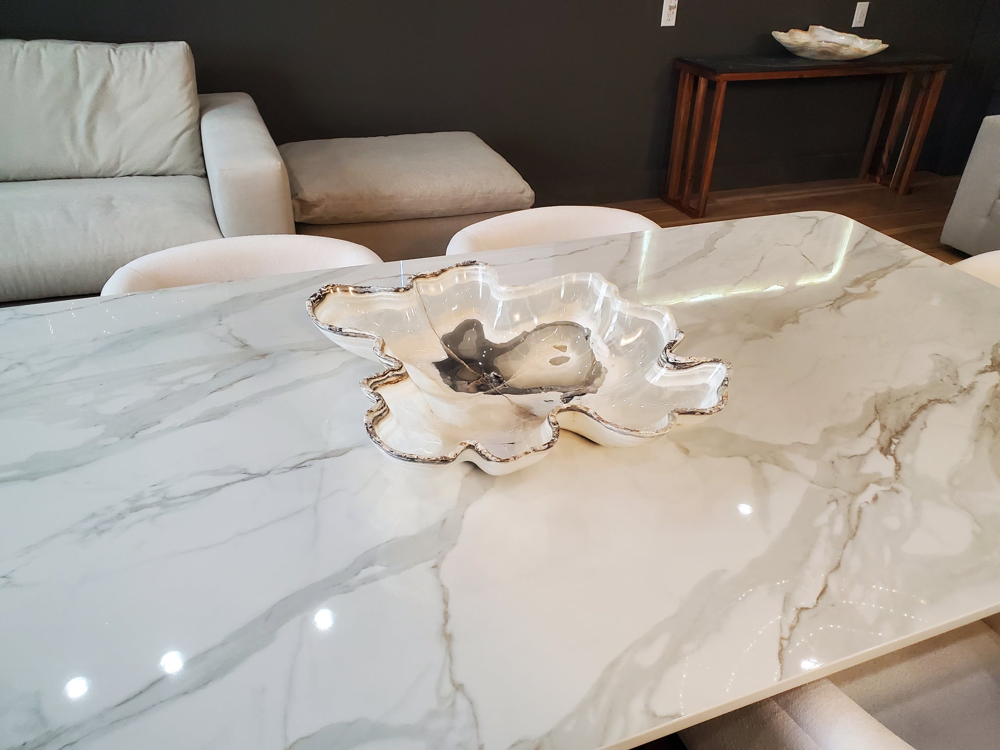 Black and white handcrafted onyx centerpiece. This precious stone has been carefully crafted for millions of years by the artisans that are our Mexican volcanoes. Each piece is unique in its nature. No extracted stone is the same as another. Our Mexican artists make sure to pick the most beautiful samples from our volcanic deposits, and therefore craft beautiful pieces of art.