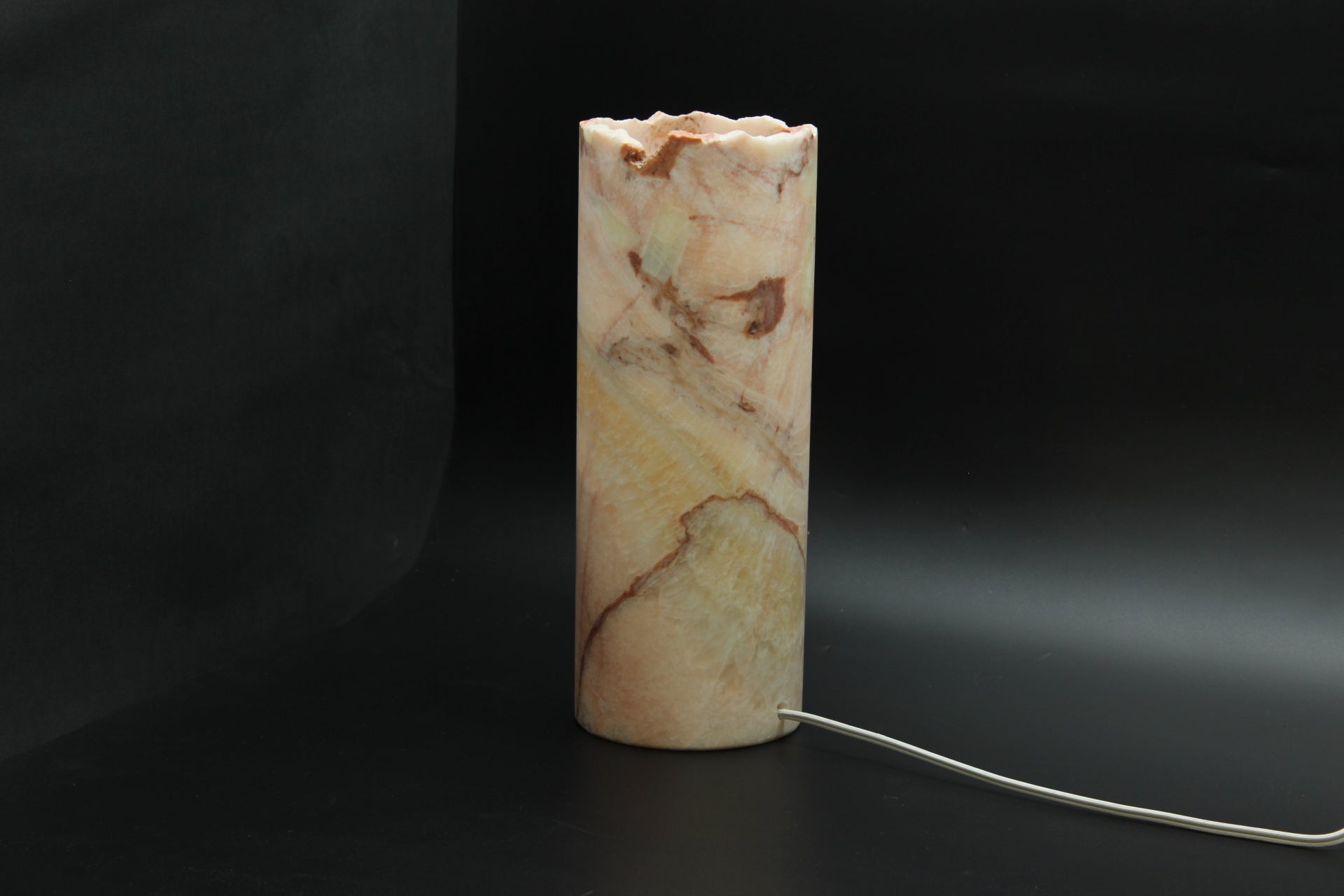Beautiful red, pink, brown and beige handcrafted onyx decorative lamp. This precious stone has been carefully crafted for millions of years by the artisans that are our Mexican volcanoes. Each piece is unique in its nature. No extracted stone is the same as another. Our Mexican artists make sure to pick the most unique samples from our volcanic deposits, and craft the most beautiful pieces of art by using the stone's magnificent translucent properties.