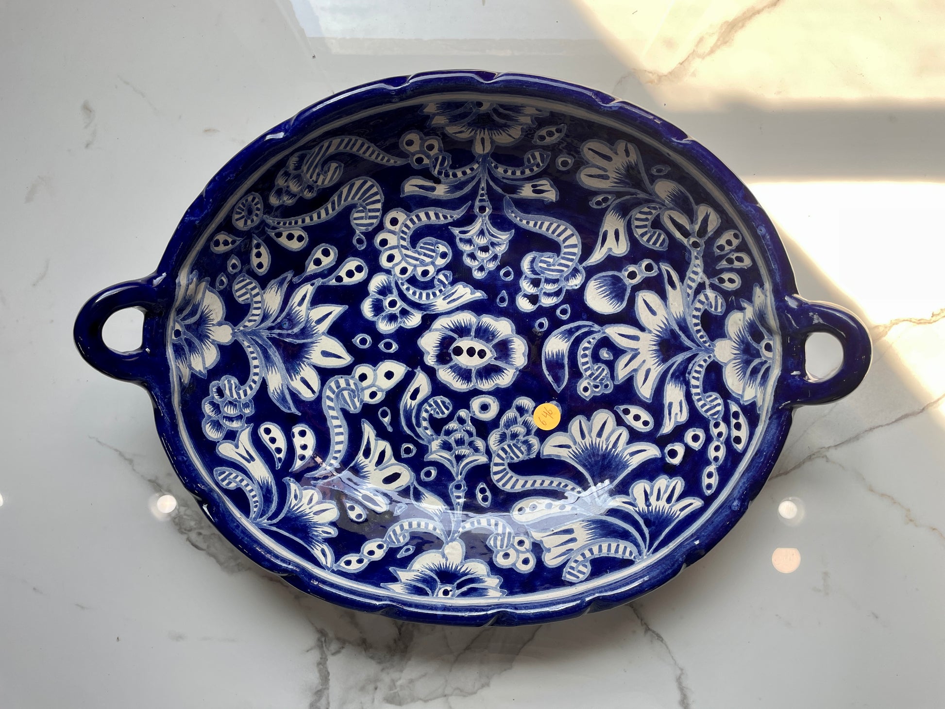 Beautiful blue and white handcrafted bowl made from Mexican Talavera. Known for its good artisan quality, Mexican Talavera ceramic products are part of the best of the world. Thanks to centuries of a huge cultural swap coming all the way from the Arabian peninsula, and then passing through the Iberic peninsula, Mexican Talavera artists have perfected and achieved a unique method that yields some fascinating and beautiful designs that will elevate the perception of your home.