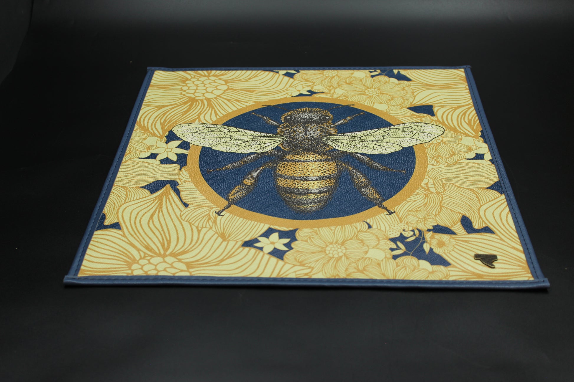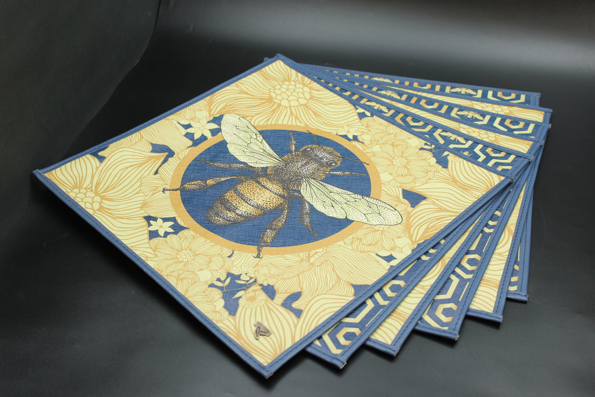 Beautiful blue & yellow beehive placemat set. (6 square mats) Dual-sided with 2 different designs.