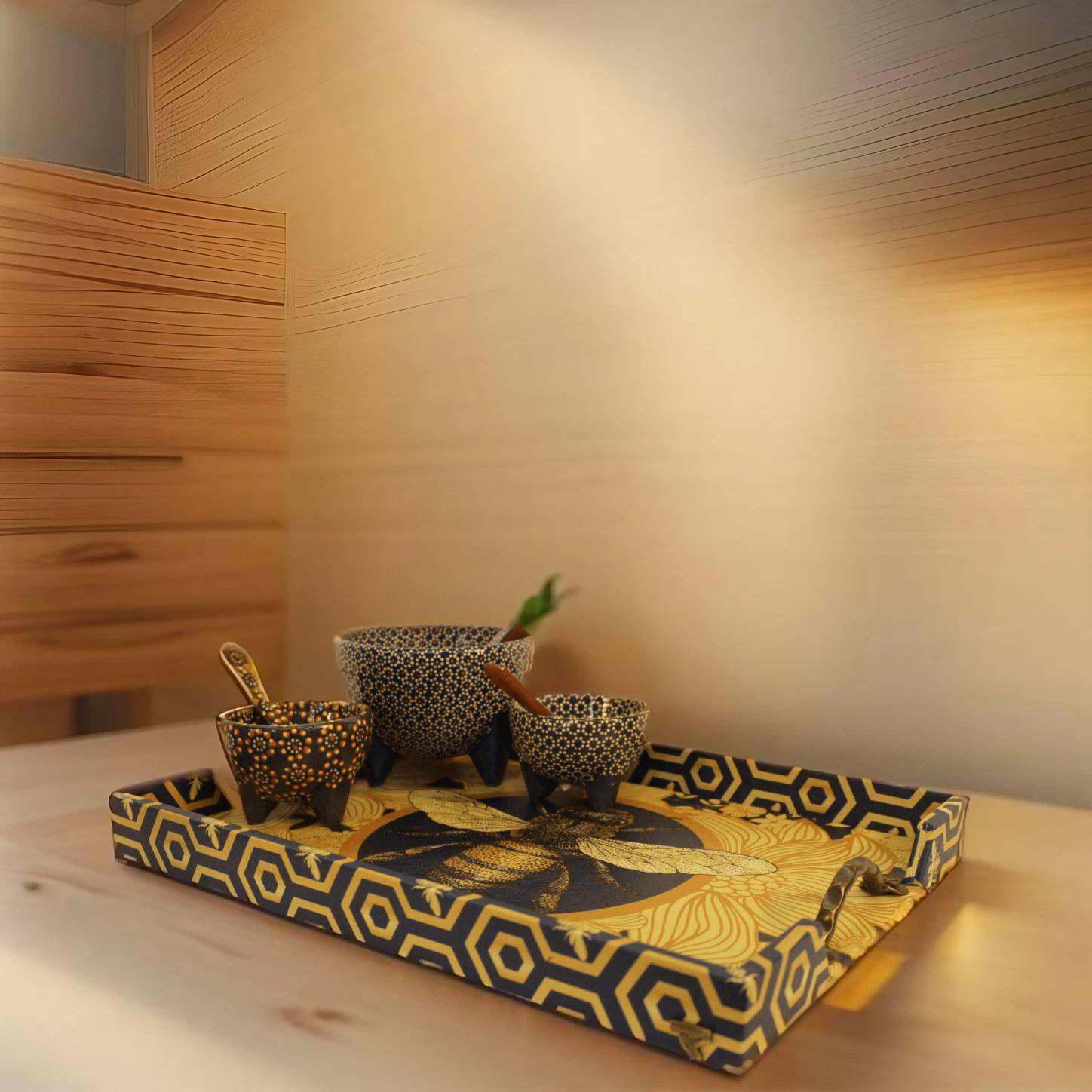 Beautiful blue & yellow, patterened, synthetic leather serving tray.