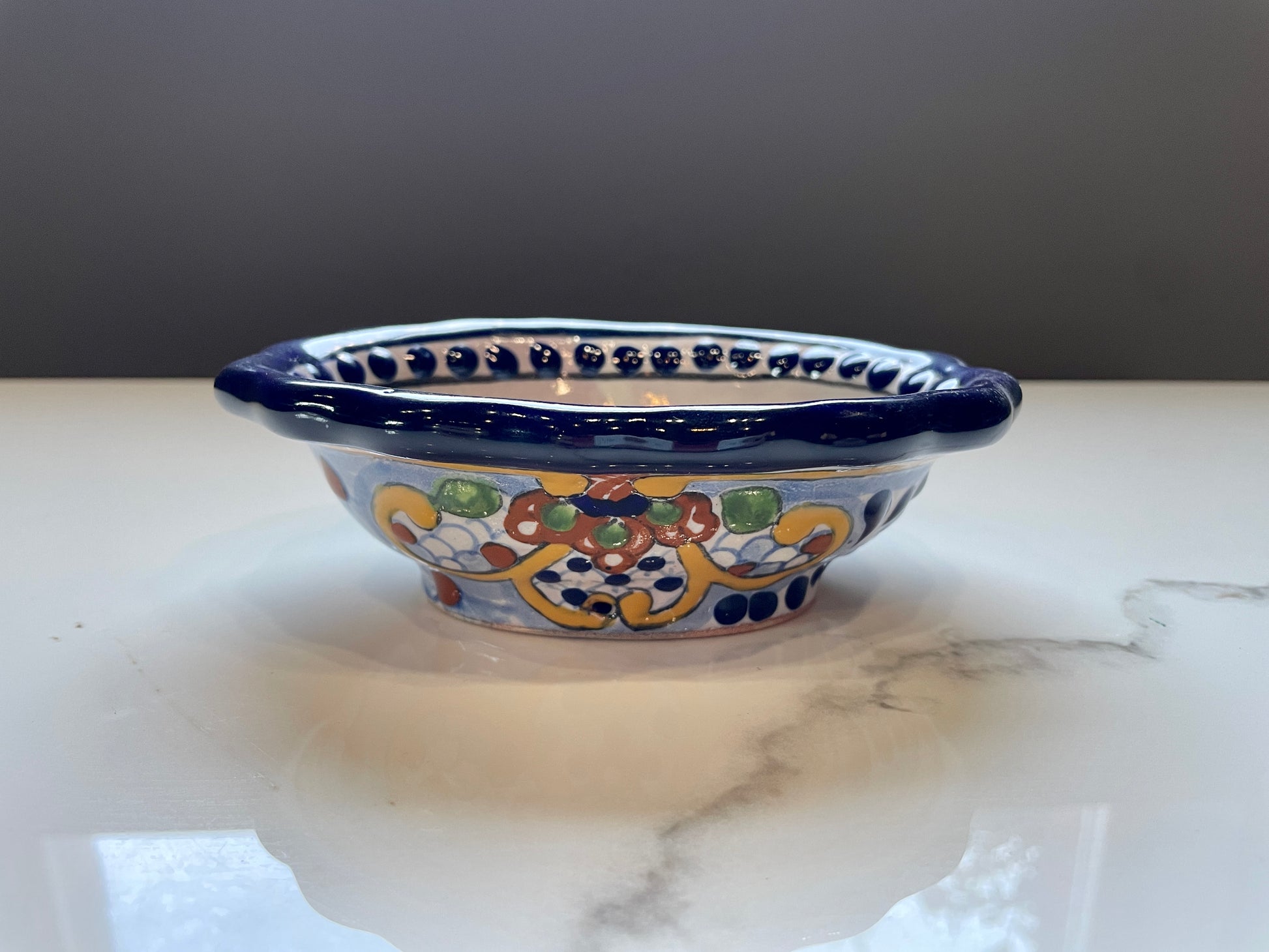 Beautiful blue, white and multicolor handcrafted bowl set made from Mexican Talavera. Known for its good artisan quality, Mexican Talavera ceramic products are part of the best of the world. Thanks to centuries of a huge cultural swap coming all the way from the Arabian peninsula, and then passing through the Iberic peninsula, Mexican Talavera artists have perfected and achieved a unique method that yields some fascinating and beautiful designs that will elevate the perception of your home.
