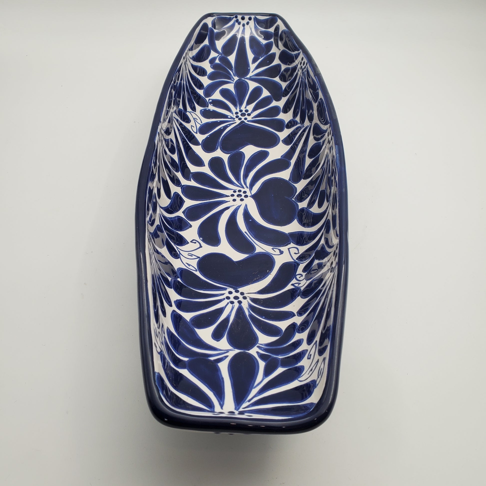 Beautiful blue and white handcrafted serving set made from Mexican Talavera. Known for its good artisan quality, Mexican Talavera ceramic products are part of the best of the world. Thanks to centuries of a huge cultural swap coming all the way from the Arabian peninsula, and then passing through the Iberic peninsula, Mexican Talavera artists have perfected and achieved a unique method that yields some fascinating and beautiful designs that will elevate the perception of your home.