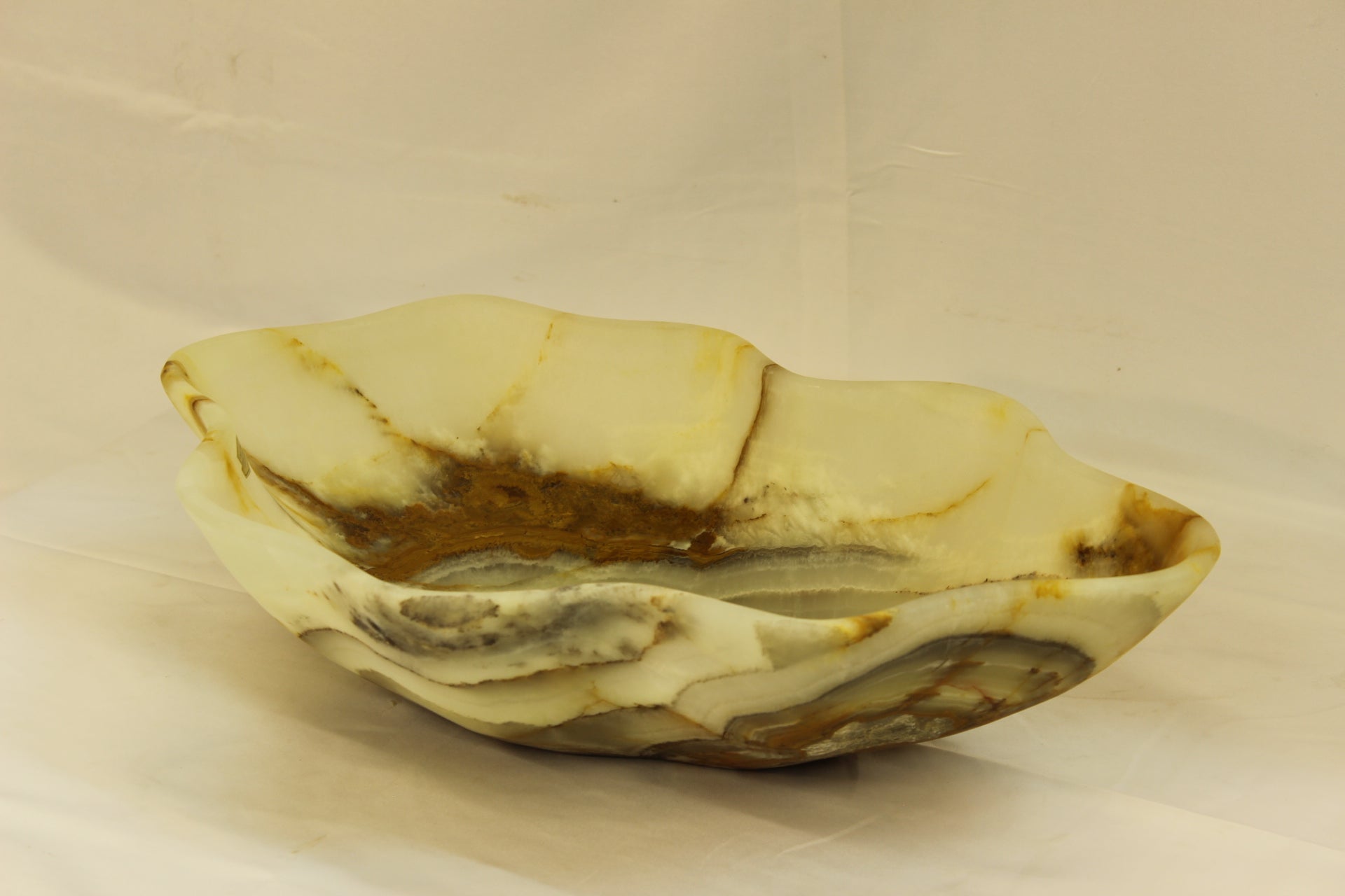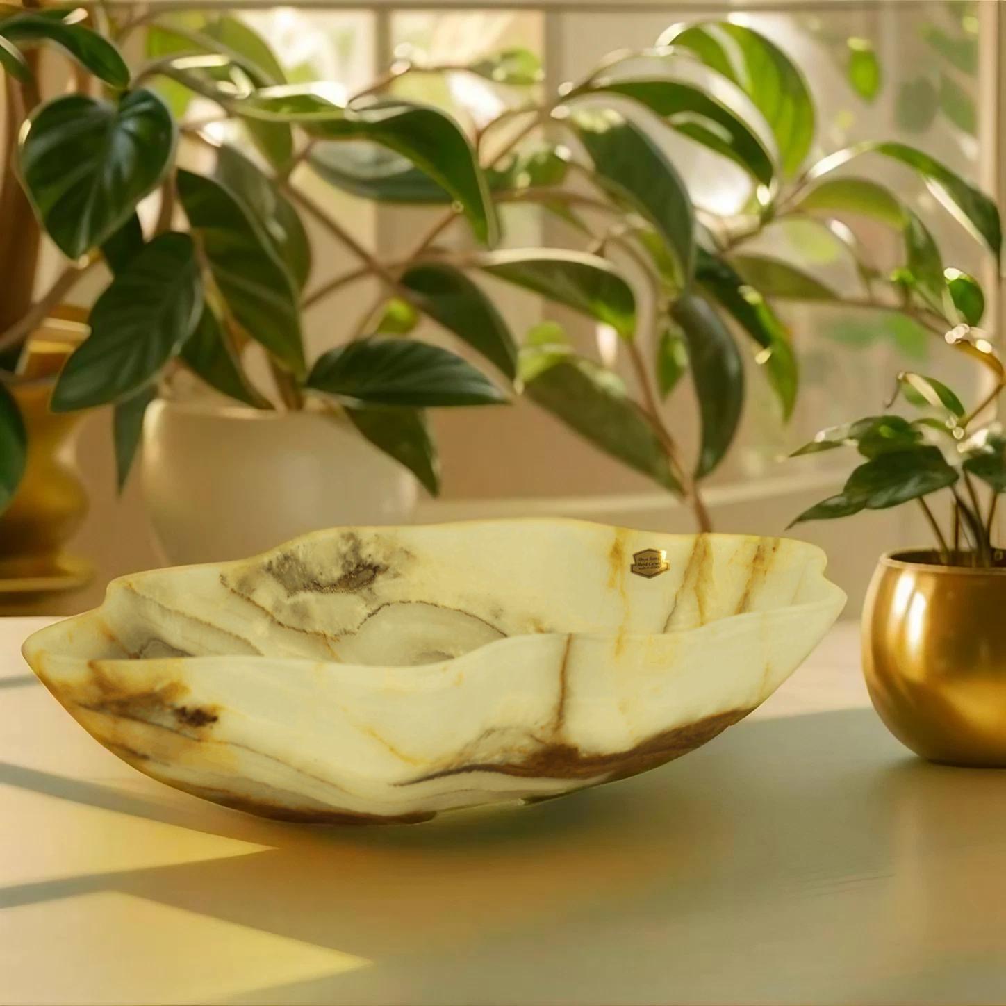 Beige and Brown handcrafted onyx centerpiece. This precious stone has been carefully crafted for millions of years by the artisans that are our Mexican volcanoes. Each piece is unique in its nature. No extracted stone is the same as another. Our Mexican artists make sure to pick the most beautiful samples from our volcanic deposits, and therefore craft astonishing pieces of art.