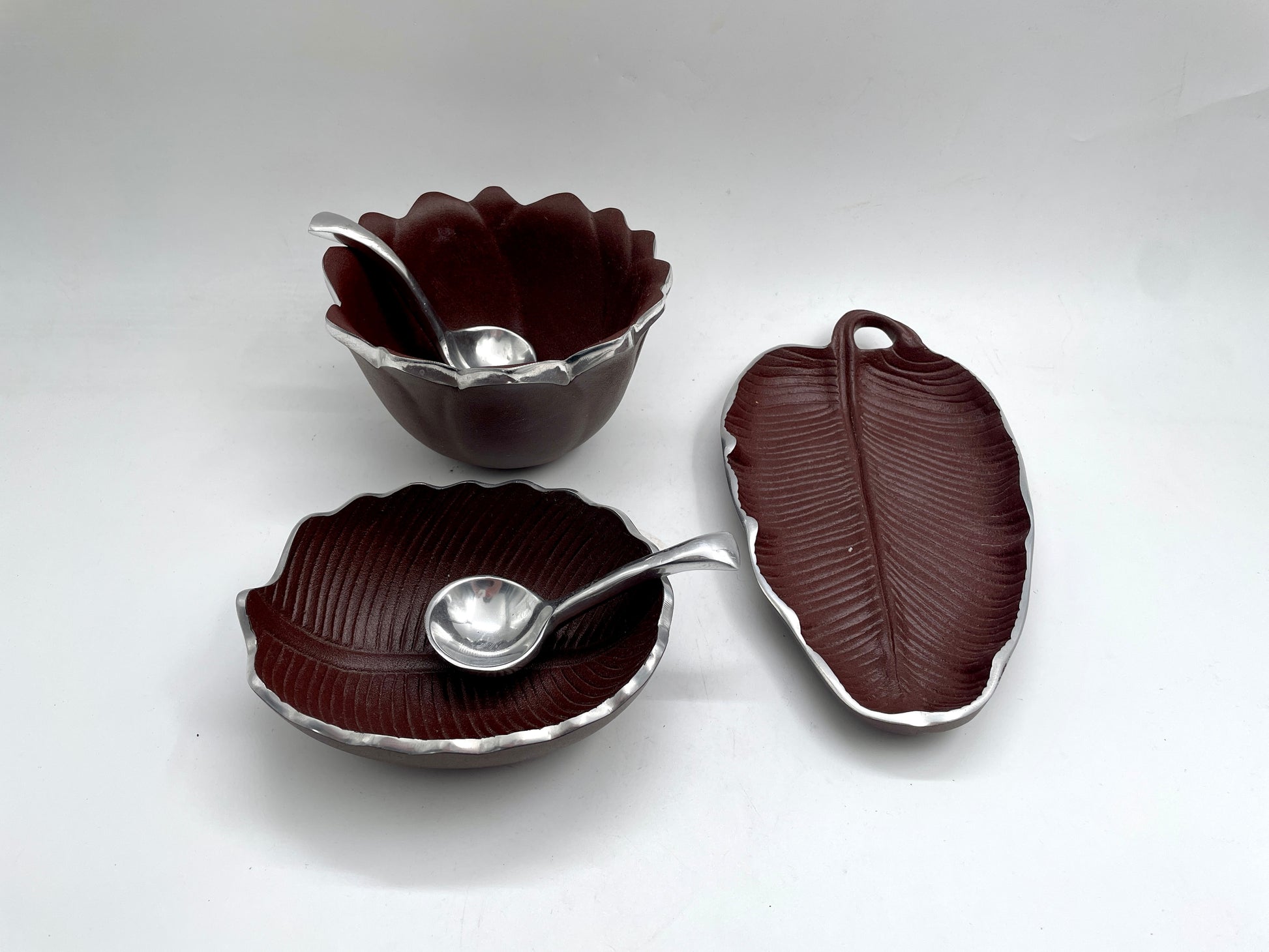 Beautiful brown flora styled pewter bowl set. Our beautiful and stylish Mexican Pewter collection will bring a modern touch to your home like no other. The products we offer in this collection are top of the line when it comes to Mexican artisan works. They are valued worldwide for their impressive designs and finishes. Don't miss out!