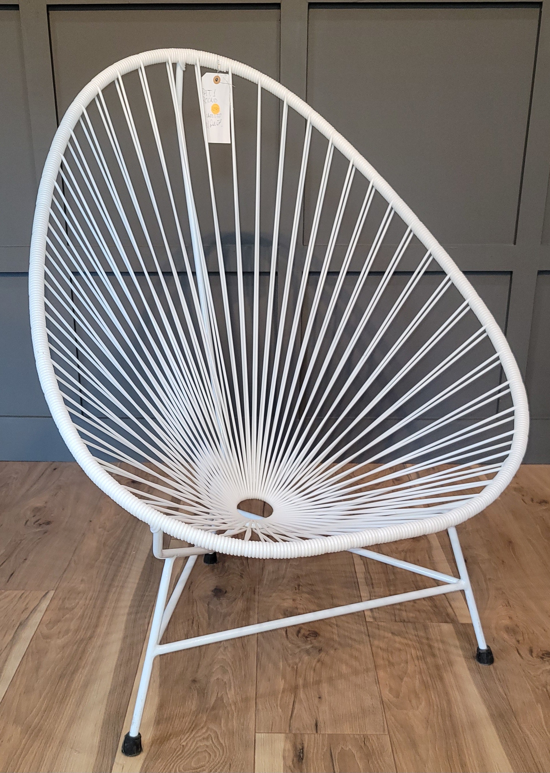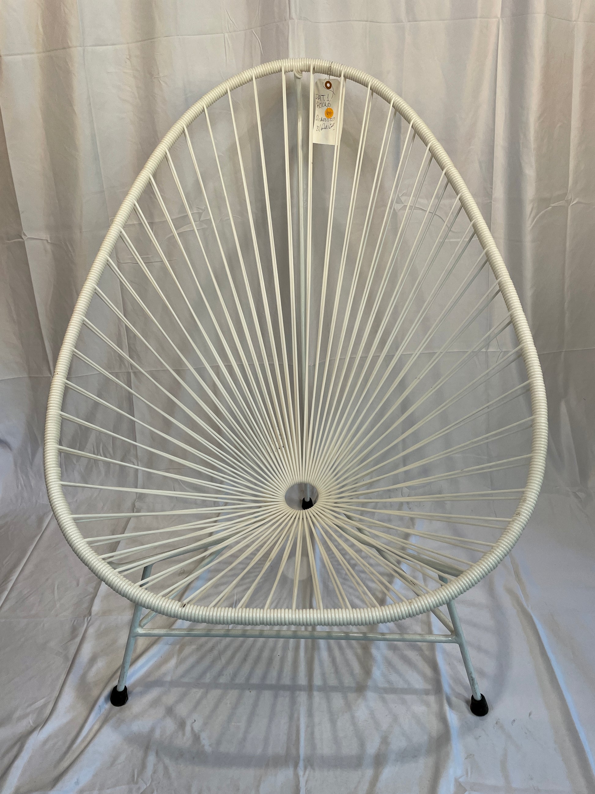 Beautiful white handcrafted oval Acapulco chair perfect for outdoors and indoors. Our beautiful collection of Acapulco styled furniture is designed to brighten the colors in your home, as well as introduce your home into the world of recycled material furniture and stylish decor.