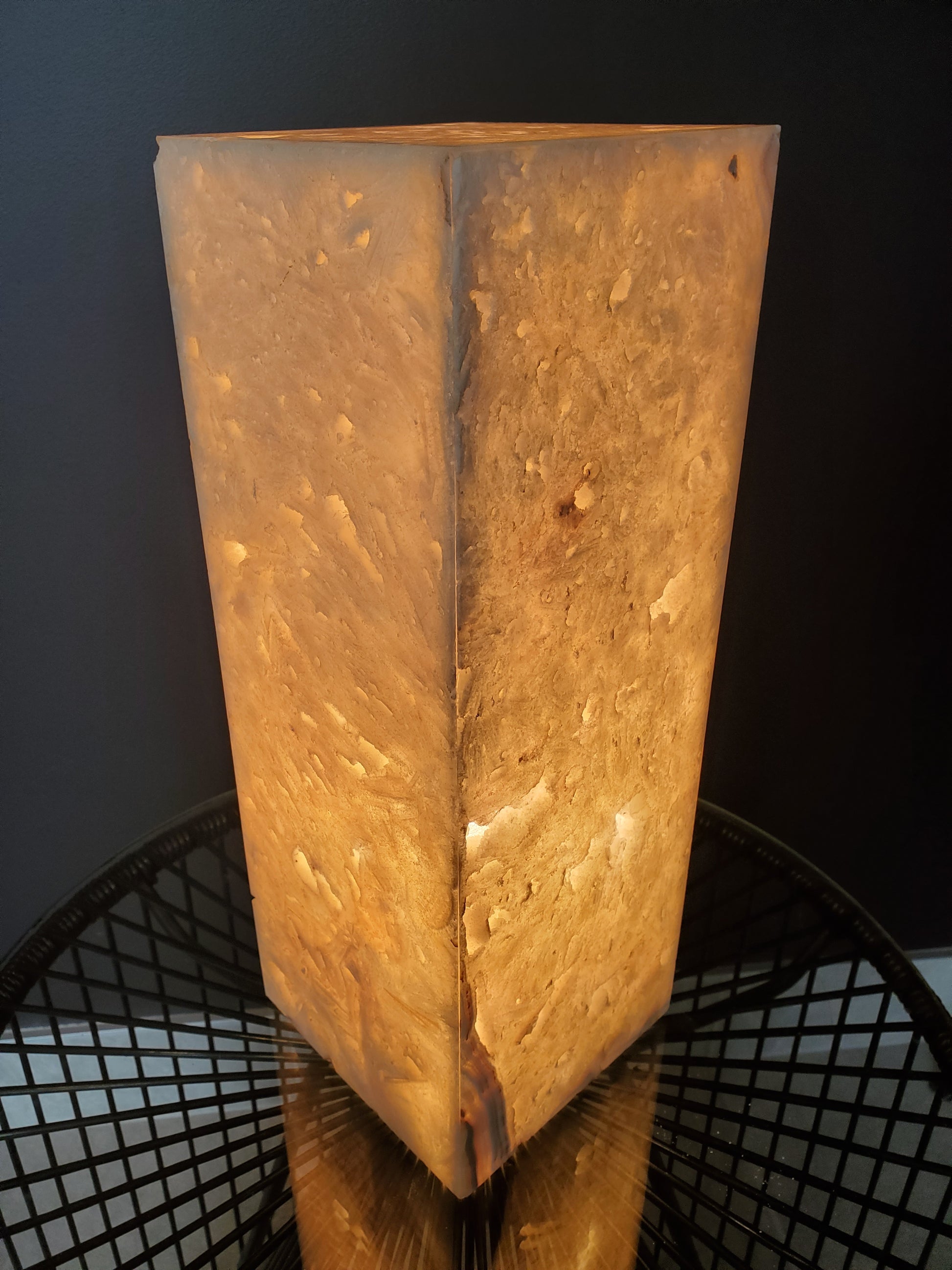 Beautiful white handcrafted decorative onyx lamp. This precious stone has been carefully crafted for millions of years by the artisans that are our Mexican volcanoes. Each piece is unique in its nature. No extracted stone is the same as another. Our Mexican artists make sure to pick the most beautiful samples from our volcanic deposits, and craft the most beautiful pieces of art by using the stone's magnificent translucent properties.