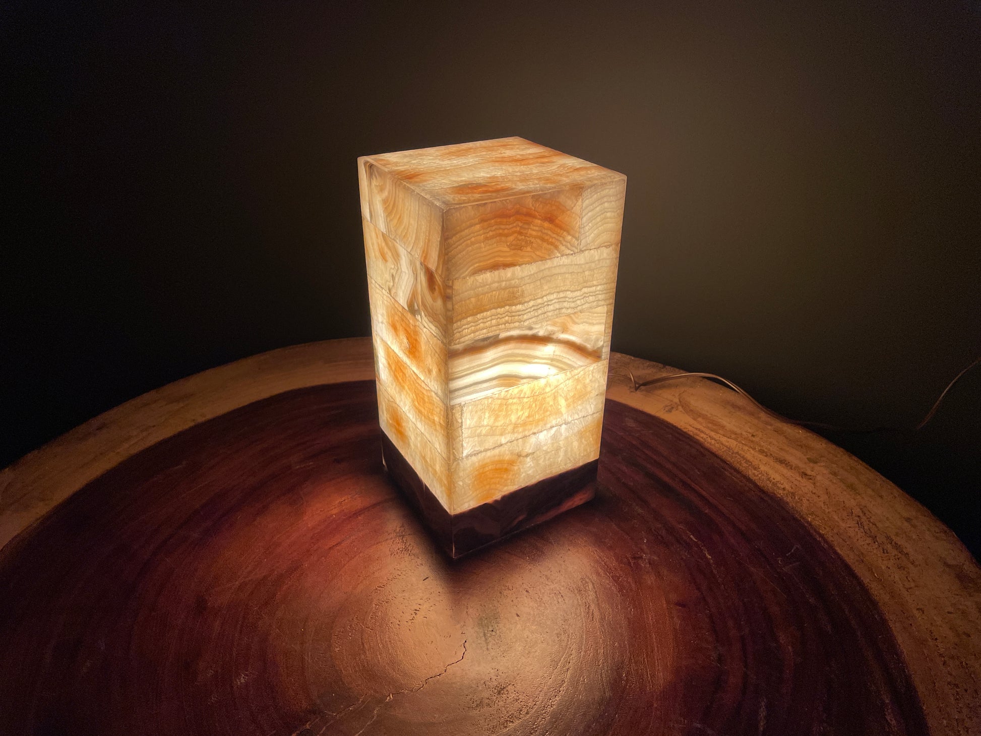 Beautiful beige handcrafted decorative onyx lamp. This precious stone has been carefully crafted for millions of years by the artisans that are our Mexican volcanoes. Each piece is unique in its nature. No extracted stone is the same as another. Our Mexican artists make sure to pick the most beautiful samples from our volcanic deposits, and craft the most beautiful pieces of art by using the stone's magnificent translucent properties.