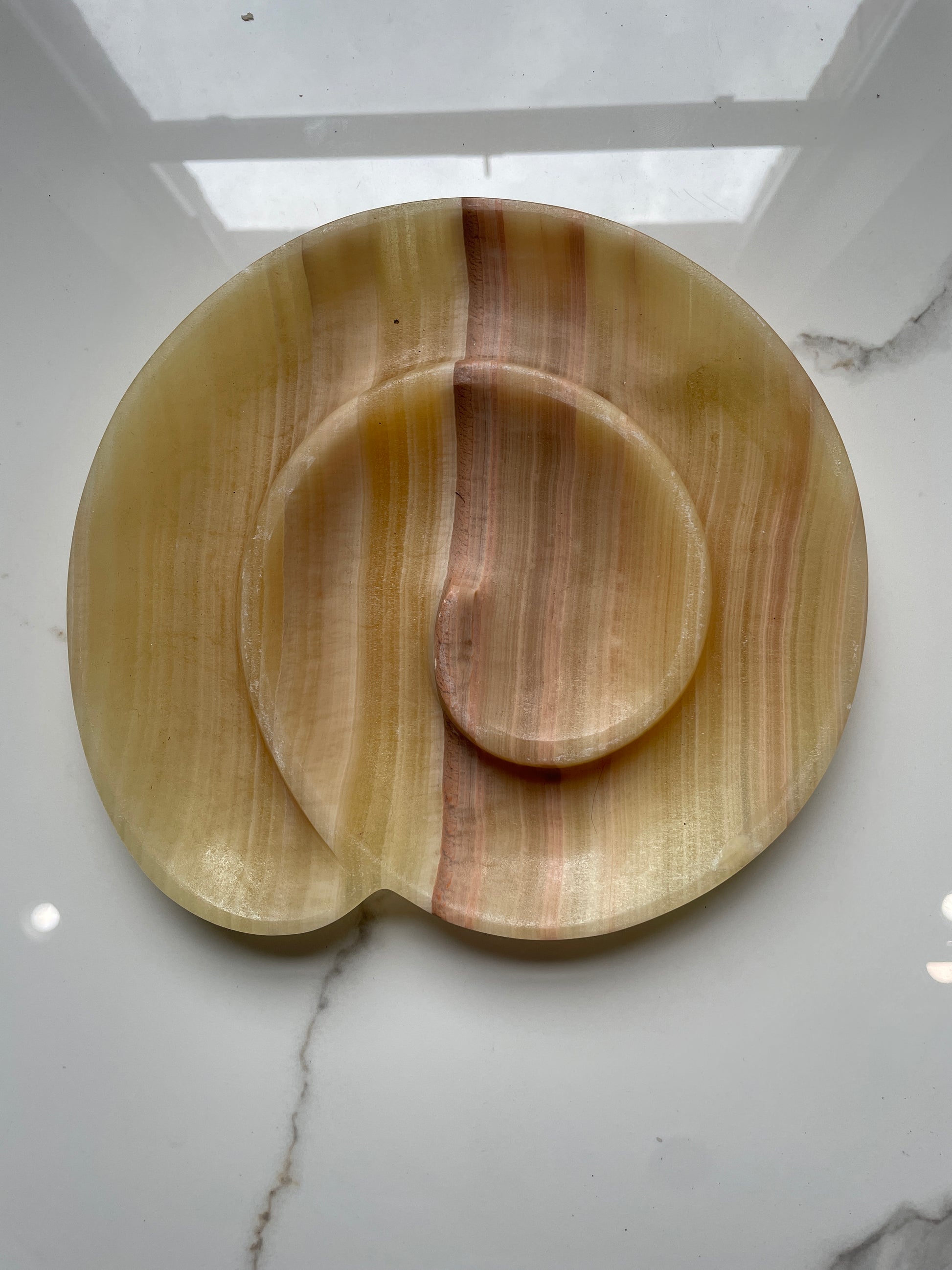 Beautiful beige handcrafted decorative spiral onyx tray. This precious stone has been carefully crafted for millions of years by the artisans that are our Mexican volcanoes, Each piece is unique in its nature. No extracted stone is the same as other ones, so our Mexican artists make sure to pick the most beautiful ones from our volcanic deposits, and therefore craft some beautiful pieces of art that will change the way your home looks and feels. In the end, aren't the small things that make the difference?