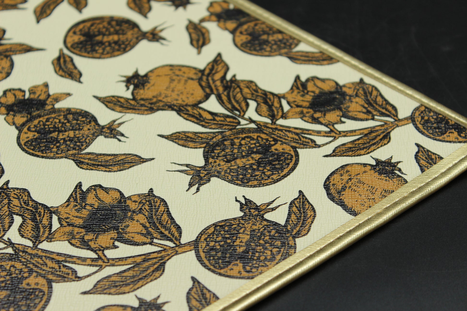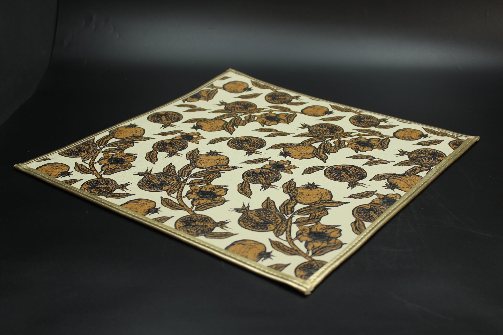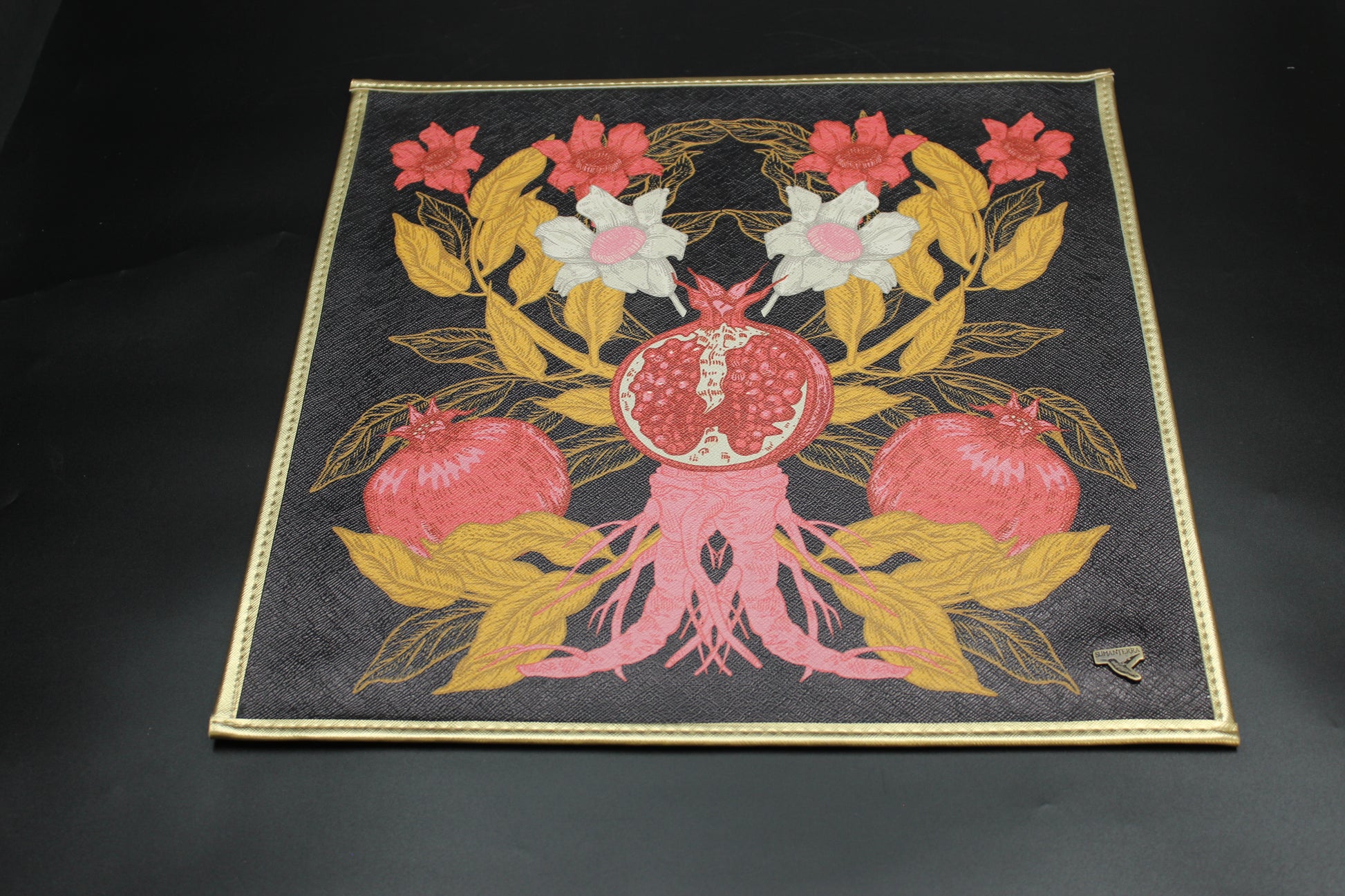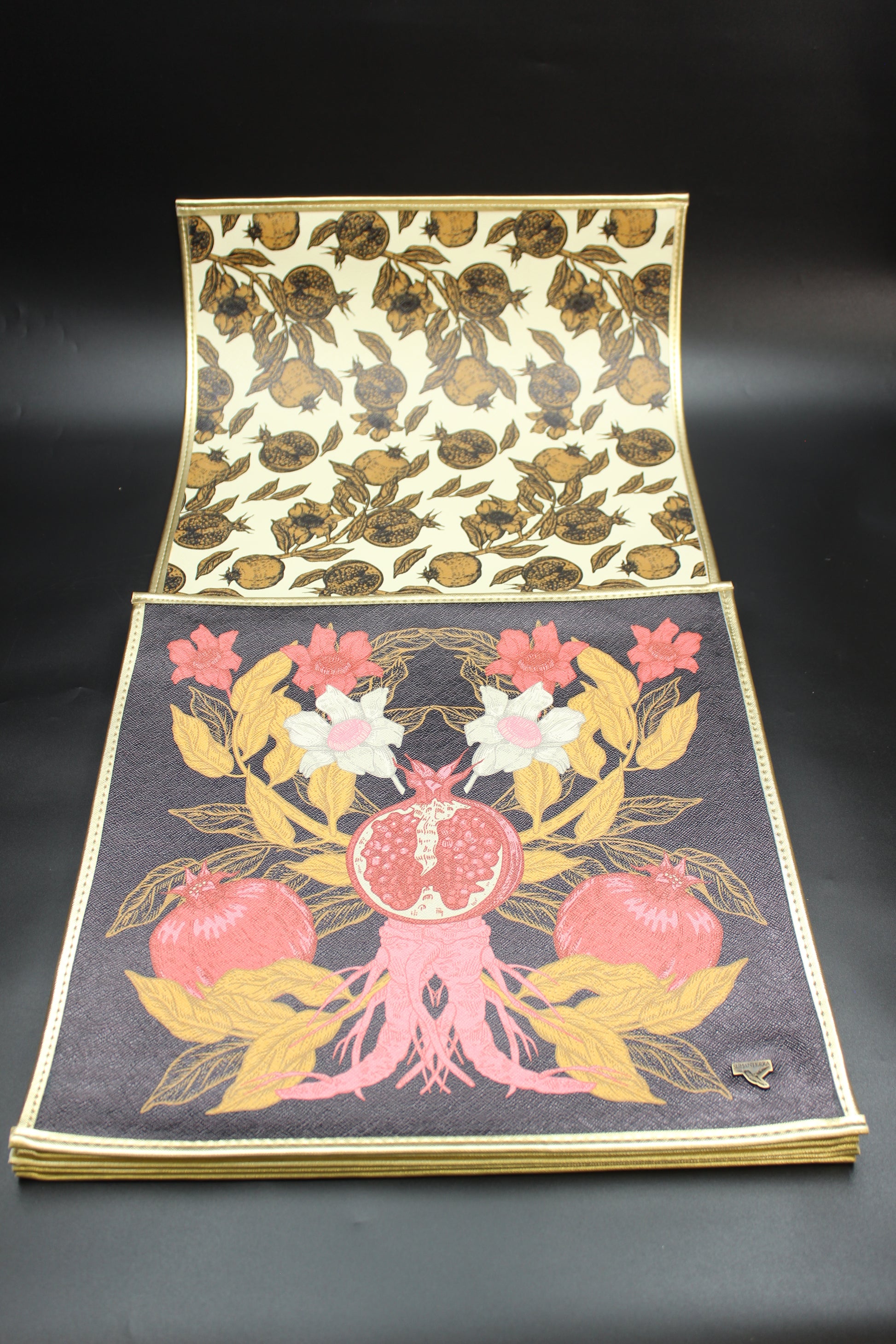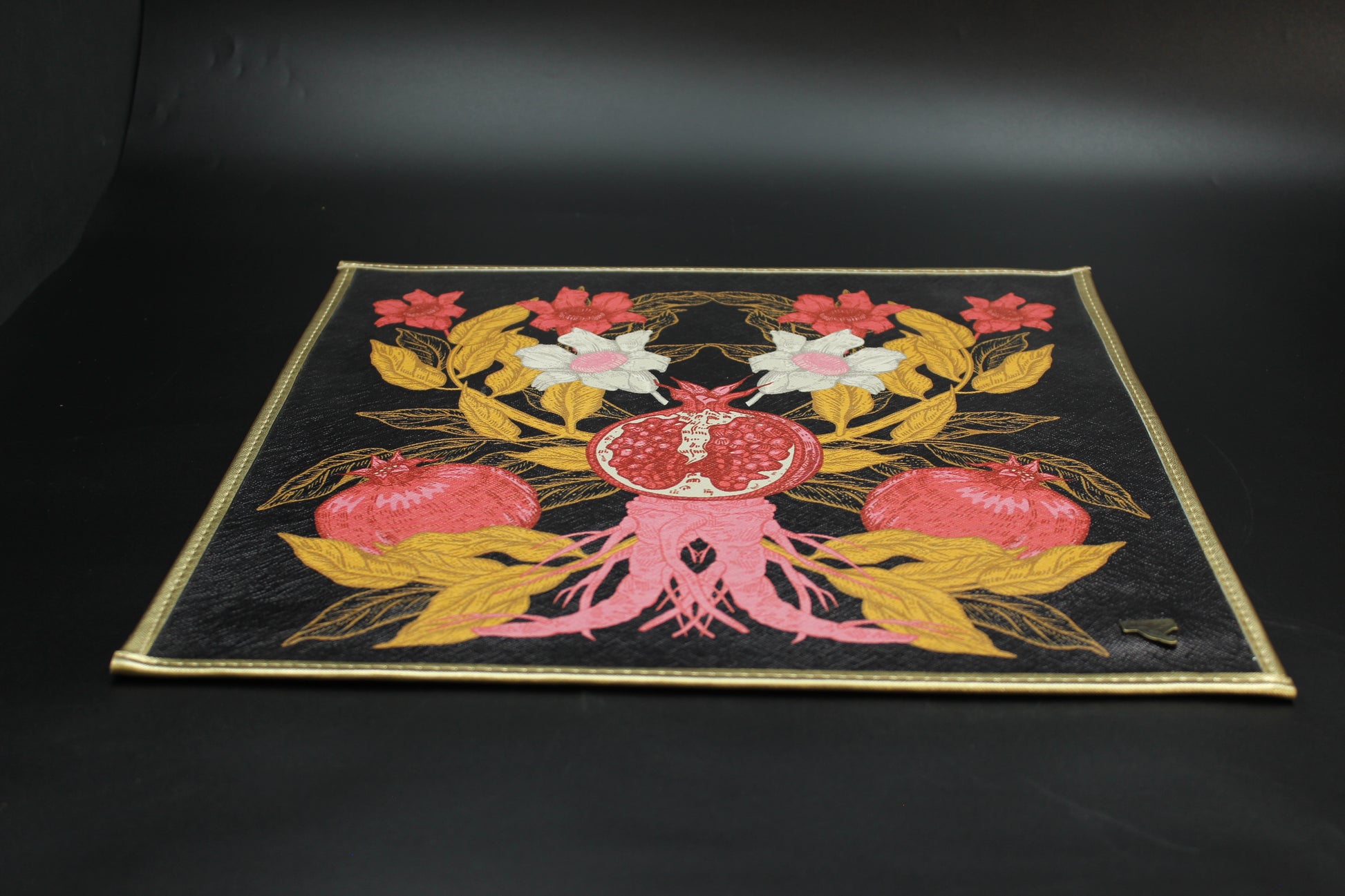 Beautiful pink pomegranate synthetic leather placemat set. (6 square mats) Dual-sided with 2 different designs.