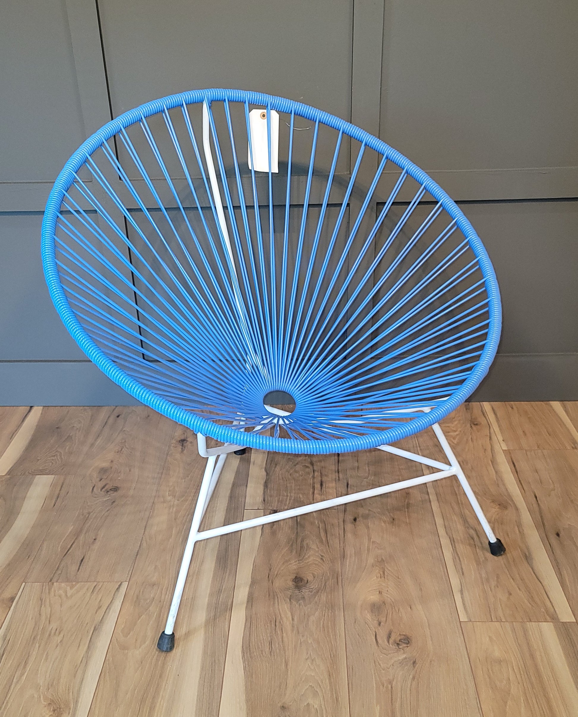Beautiful blue handcrafted round Acapulco chair perfect for outdoors and indoors. Our beautiful collection of Acapulco styled furniture is designed to brighten the colors in your home, as well as introduce your home into the world of recycled material furniture and stylish decor.