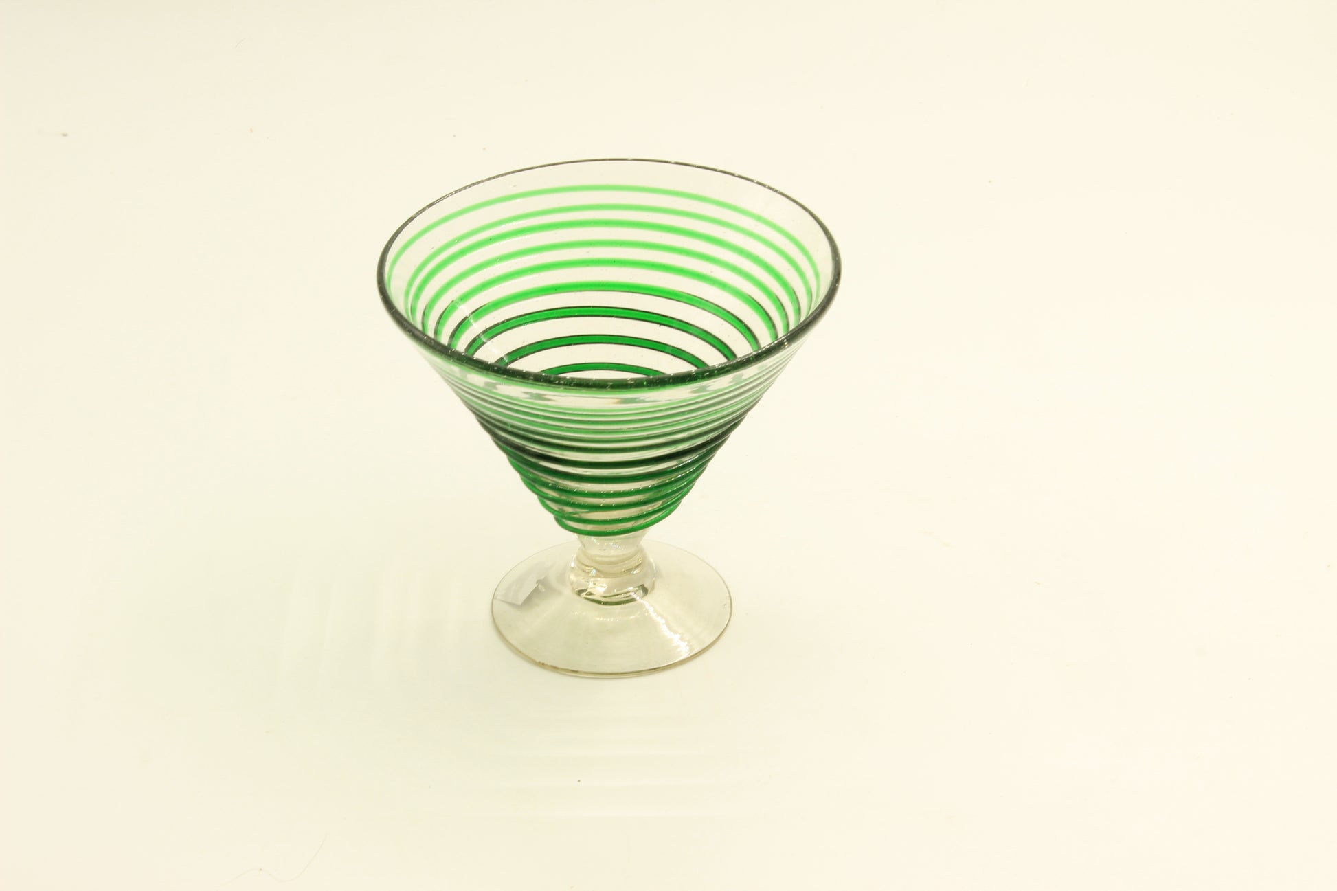 Beautiful green and transparent blown glass set. Only compared with the Italian blown glass techniques from Murano, the blown glass quality from Tlaquepaque in Mexico is from the best of its kind in the world. Every artist has dedicated their lifetime to master this technique, and as a result of generations of perfectioning said technique, the artists produce some of the best blown glass pieces in the world.