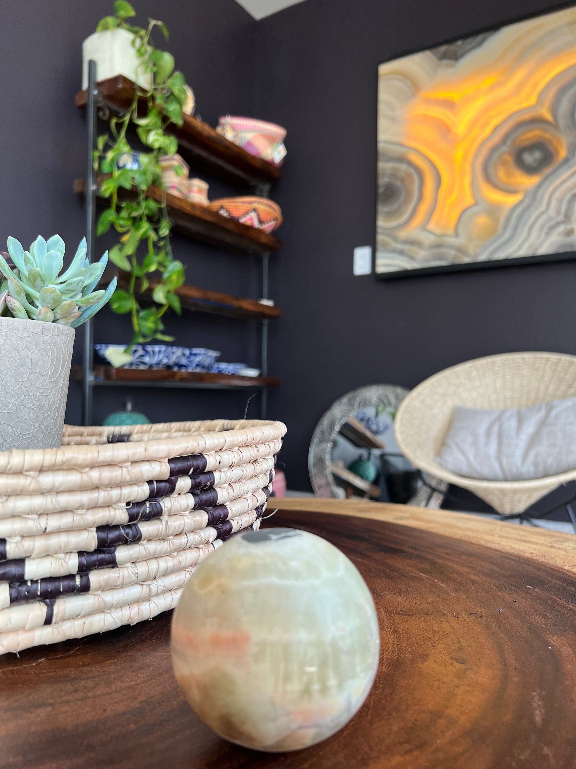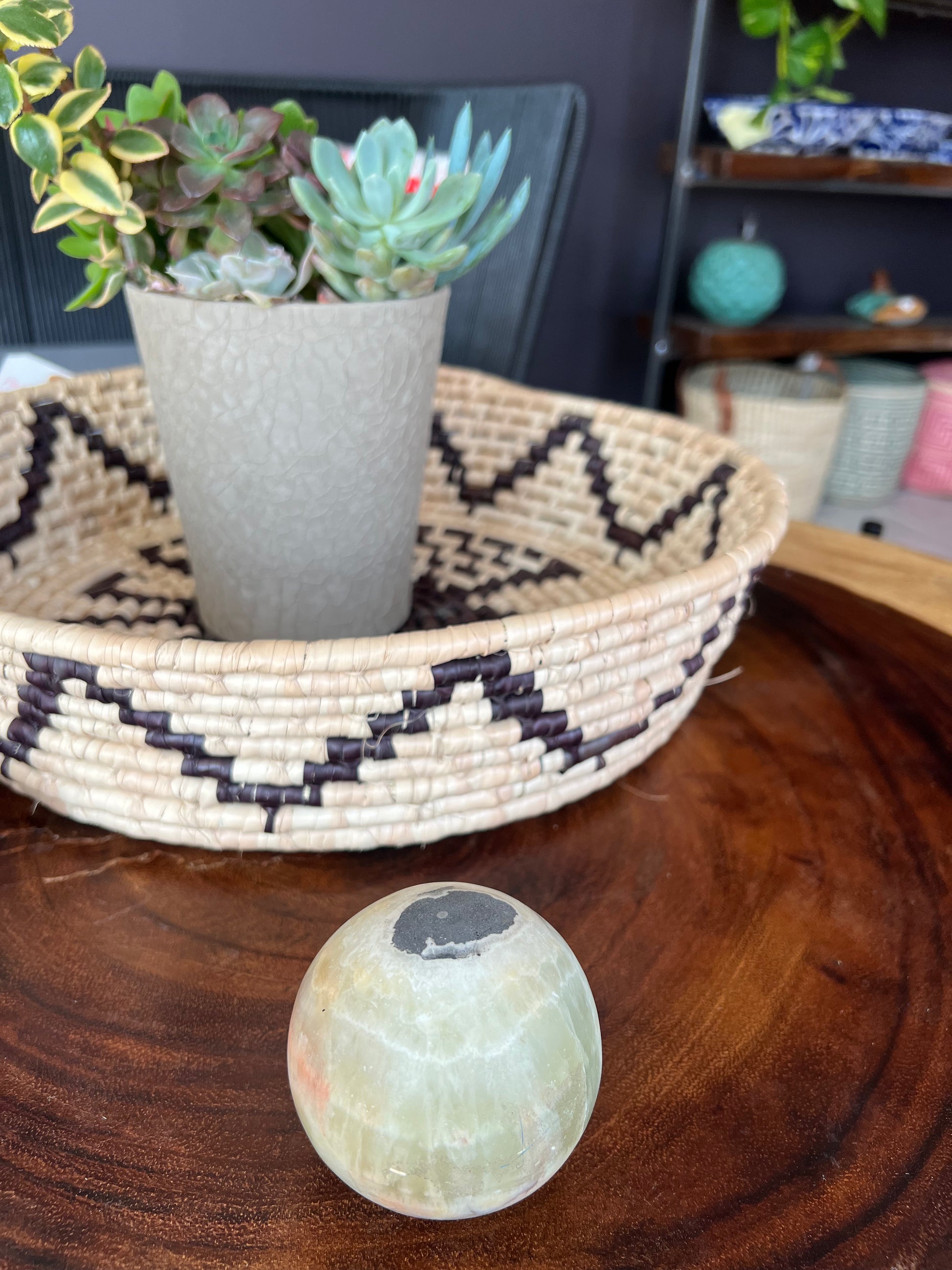 Beautiful green, white and black decorative onyx sphere. This precious stone has been carefully crafted for millions of years by the artisans that are our Mexican volcanoes, Each piece is unique in its nature. No extracted stone is the same as other ones, so our Mexican artists make sure to pick the most beautiful ones from our volcanic deposits, and therefore craft some beautiful pieces of art that will change the way your home looks and feels. In the end, aren't the small things that make the difference?