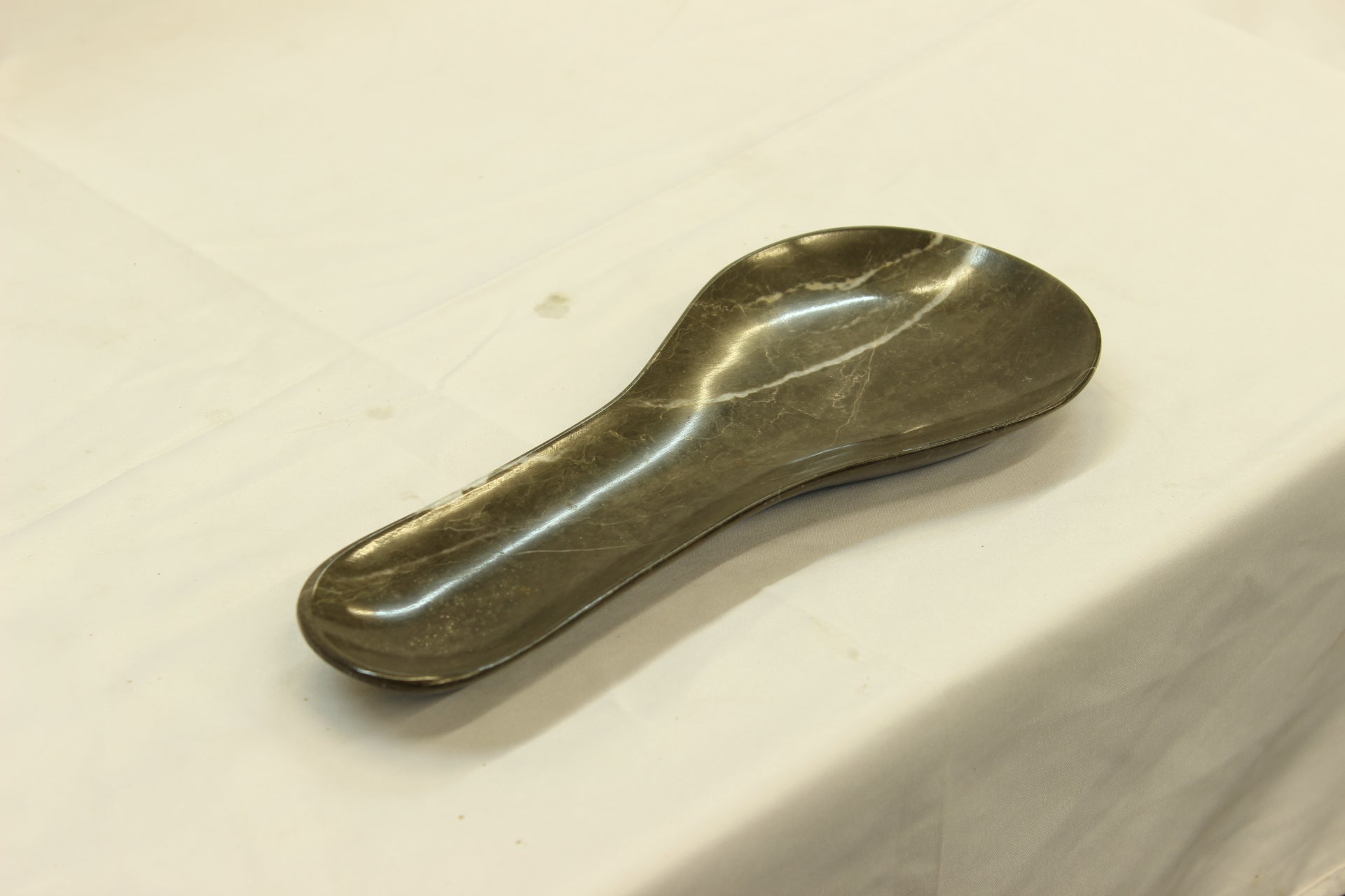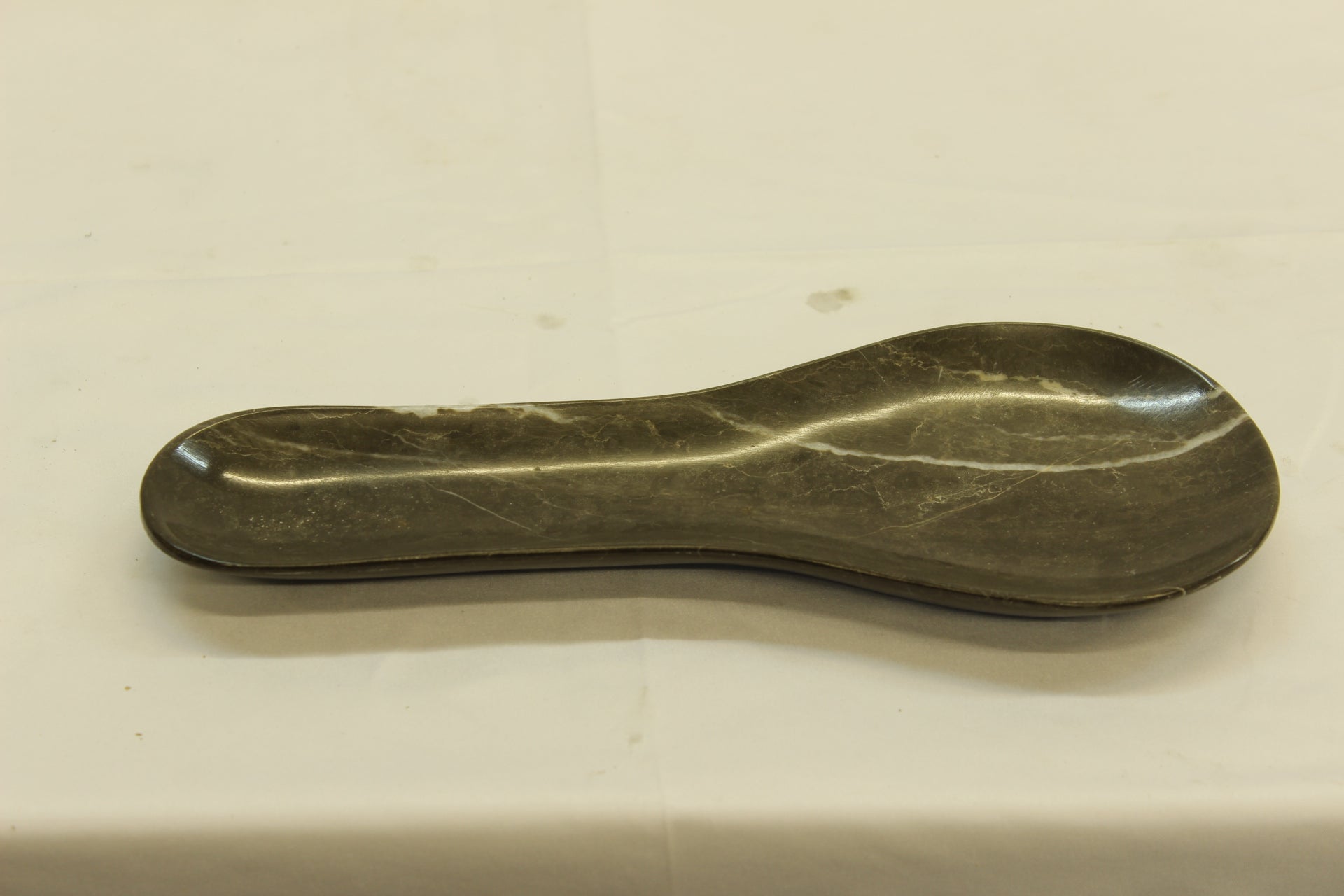 Gray & white marble rest for cooking spoons & spatulas. Also makes a cute decorative piece.