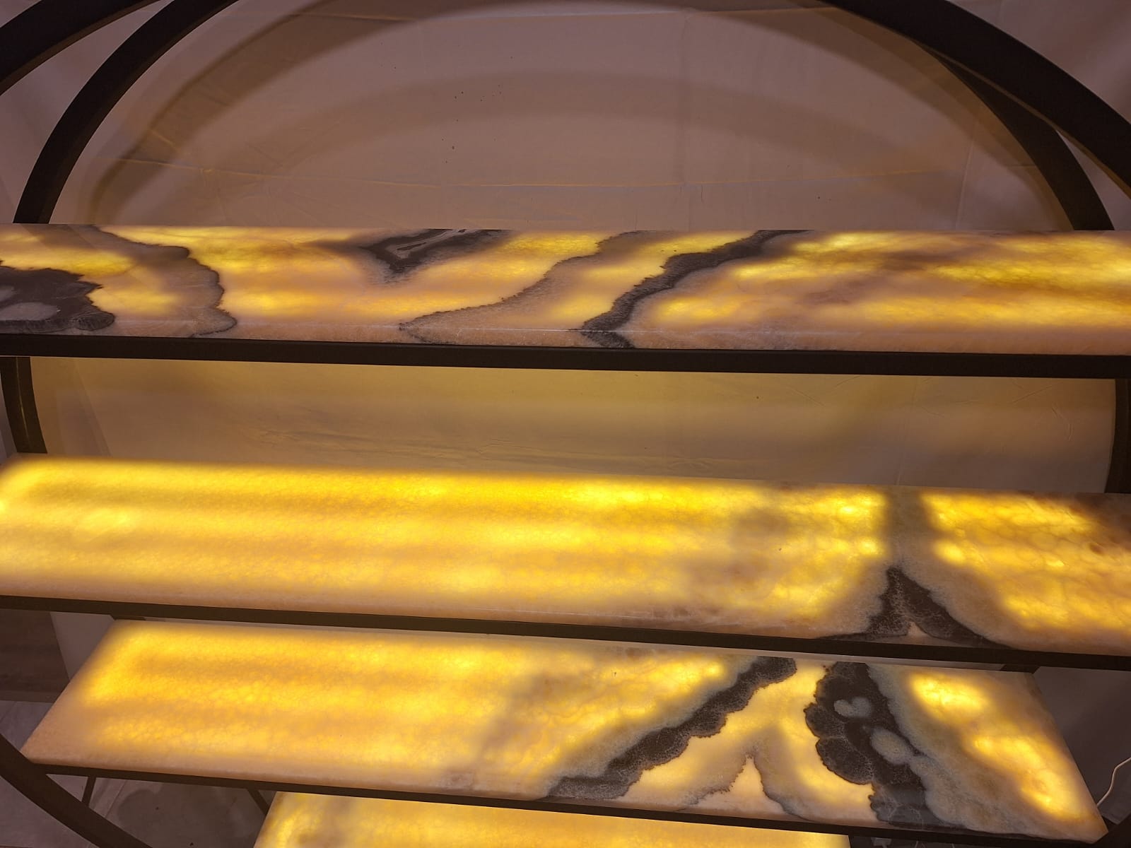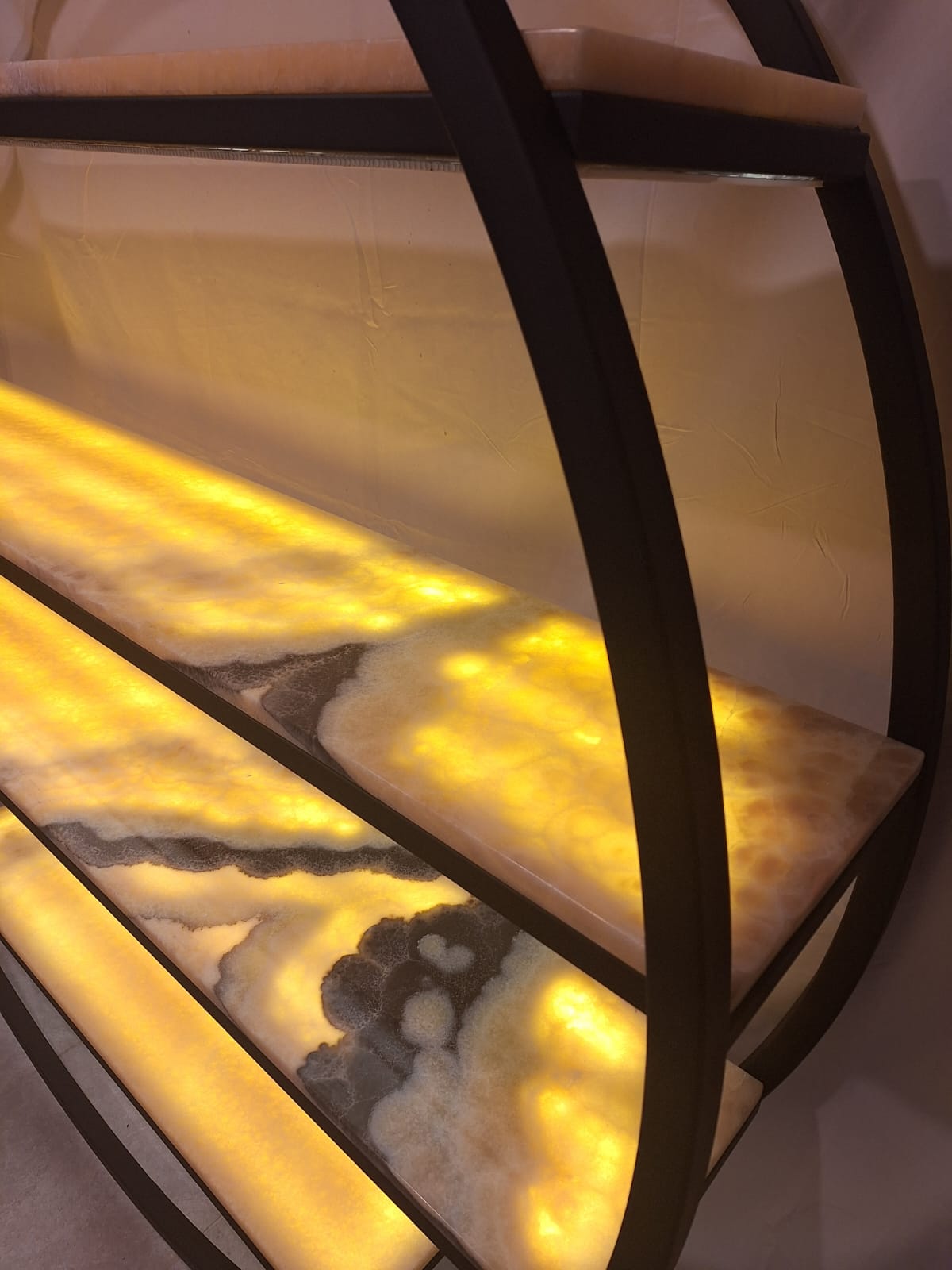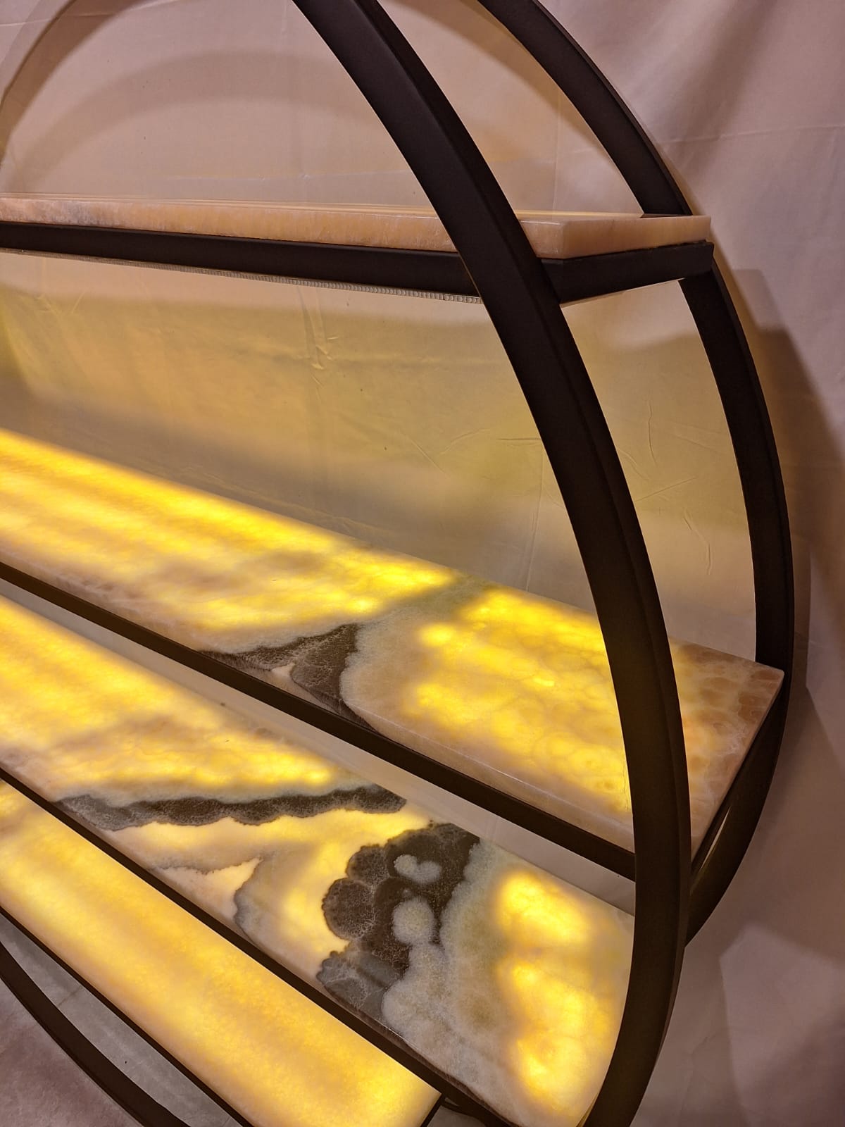 Handmade, one of a kind, iron and stone custom bookshelf. Features an iron frame standing about 74" high, with real Onyx Stone shelves underlit by LEDs.