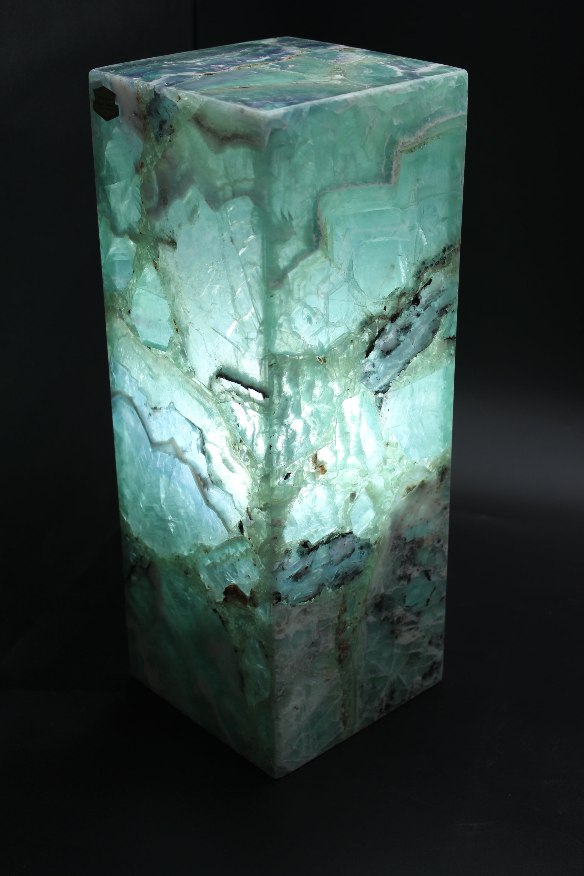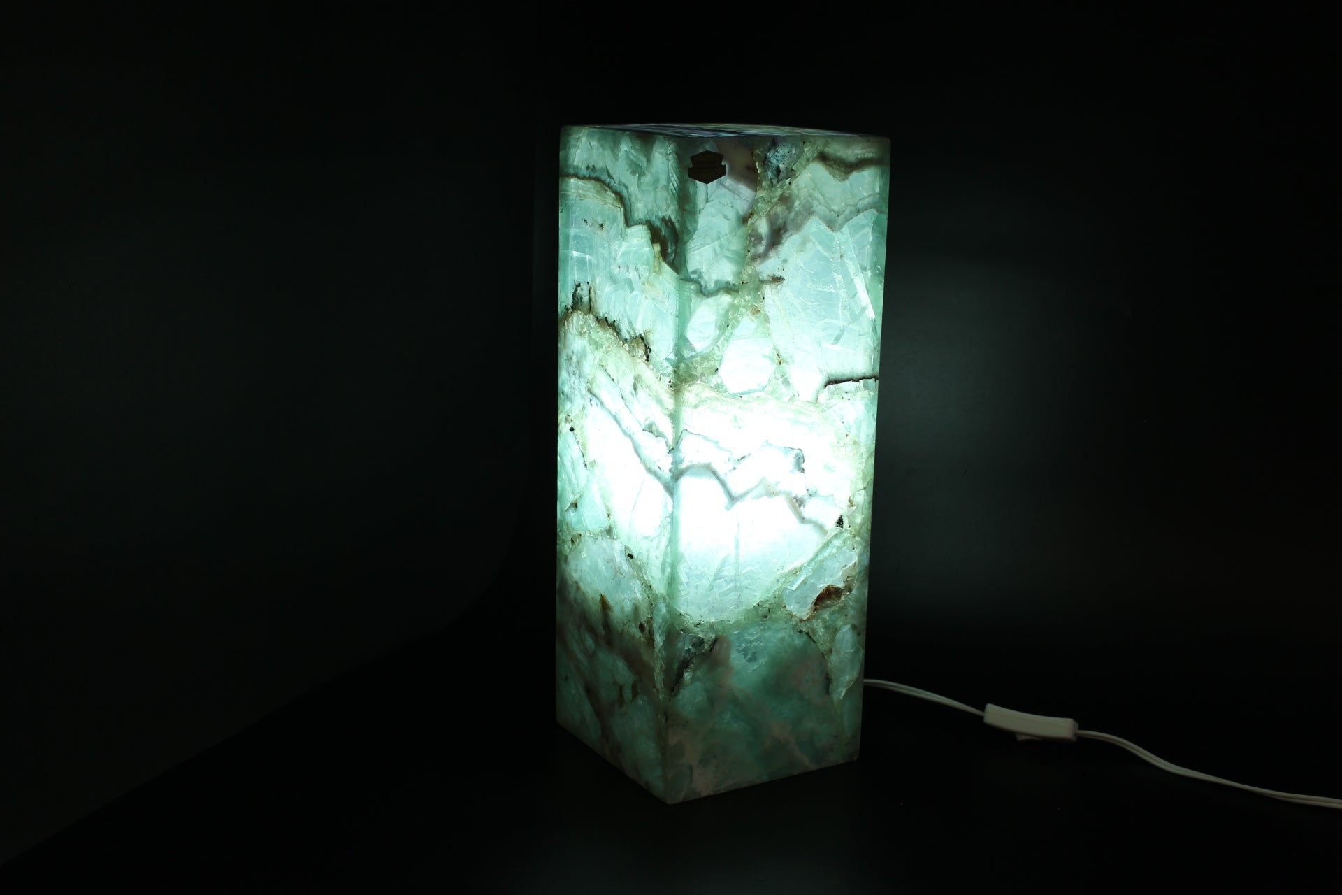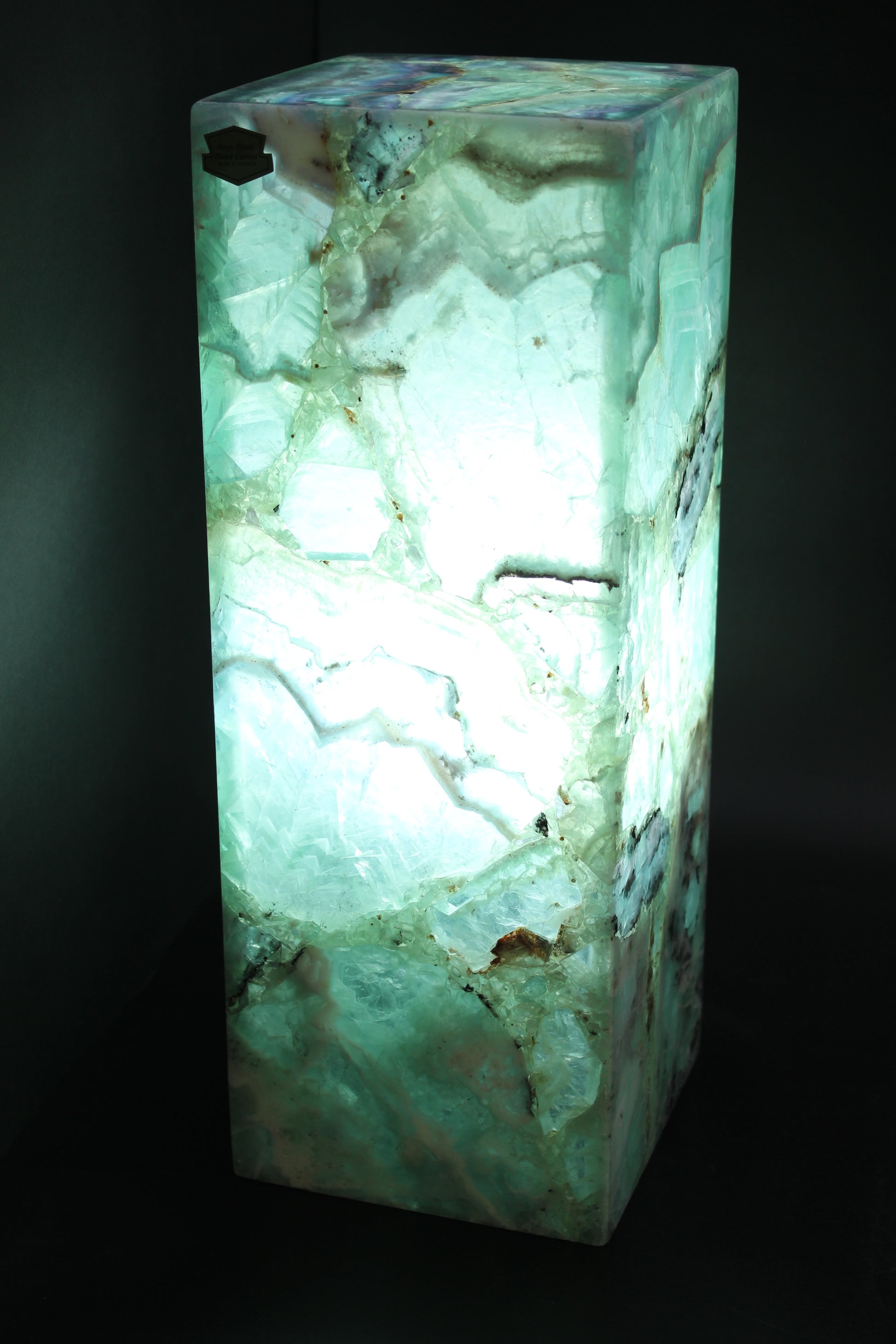 Beautiful green and white handcrafted fluorite decorative lamp. This precious stone has been carefully crafted for millions of years by the artisans that are our Mexican volcanoes. Each piece is unique in its nature. No extracted stone is the same as another. Our Mexican artists make sure to pick the most unique samples from our volcanic deposits, and craft the most beautiful pieces of art by using the stone's magnificent translucent properties.