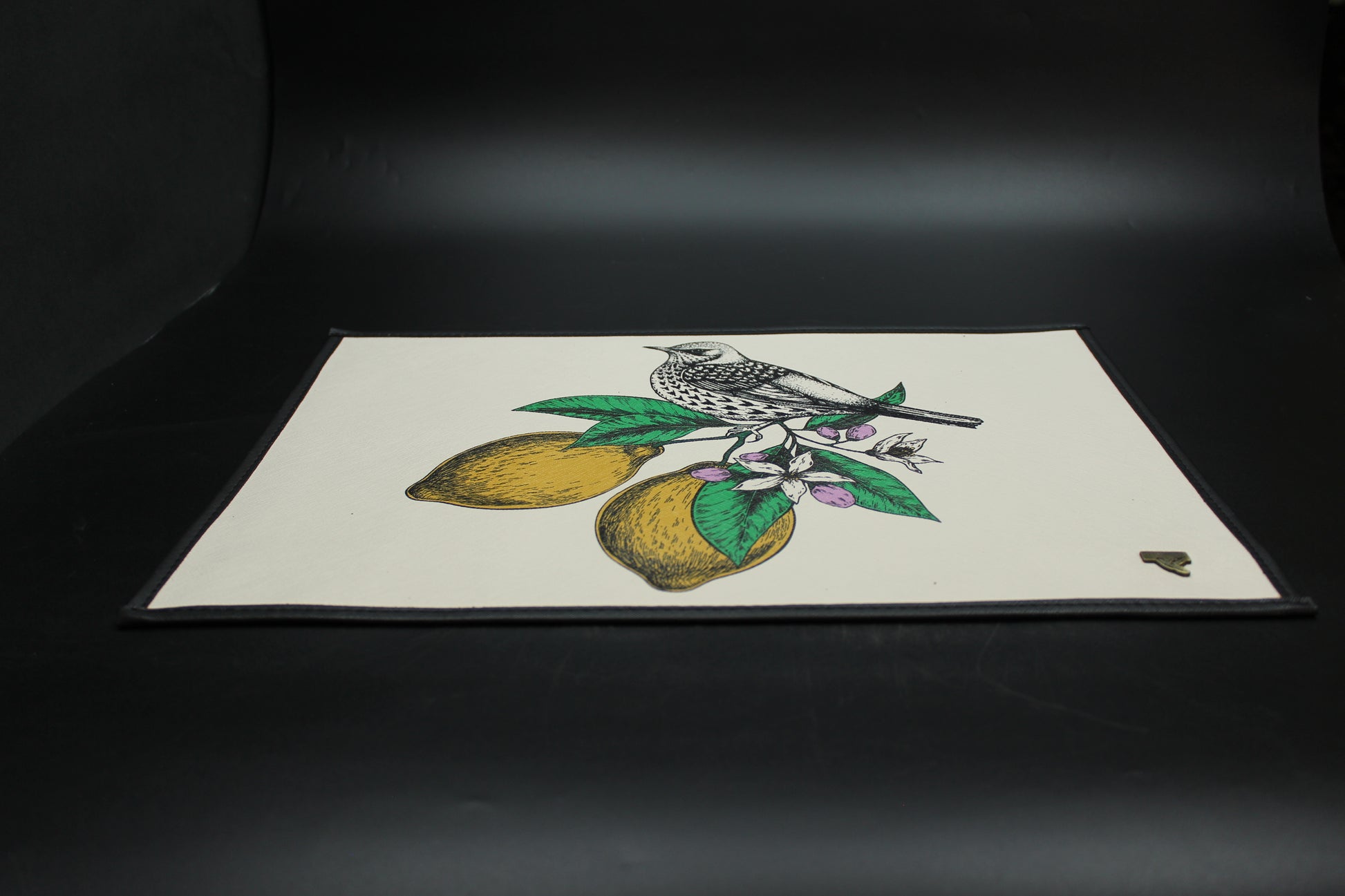 Beautiful lemon & mockingbird synthetic leather placemat set. (6 rectangular mats) Dual-sided with 2 different designs.