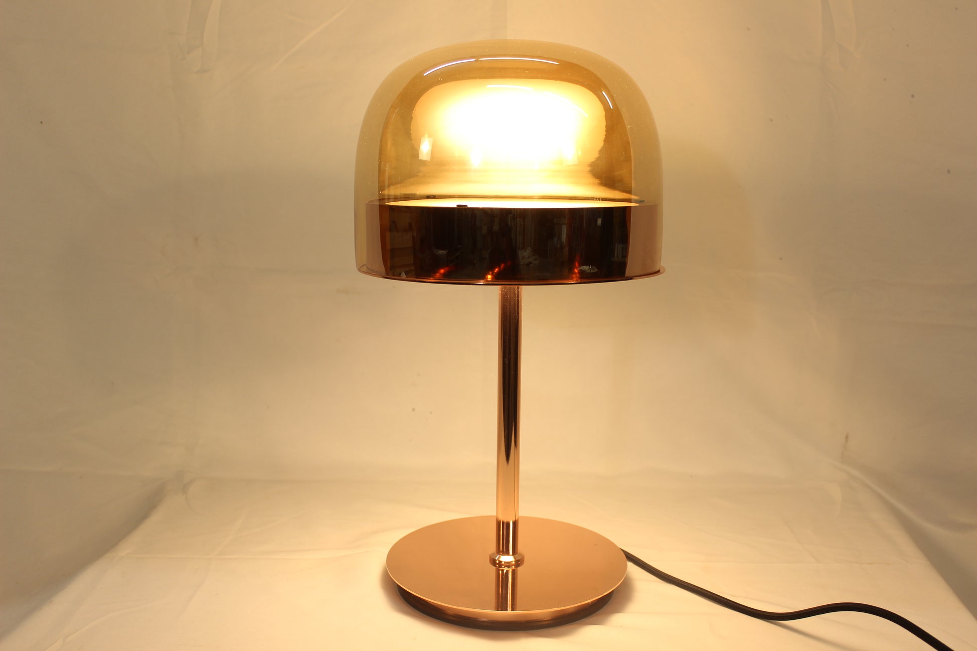 This product was originally designed for hotel lobbys. Table Lamp in Metal with polished Copper finish, Acrylic Diffuser, Warm White LED, On/Off ONLY switch, Textile Power Cord and Polarized plug. 120VAC