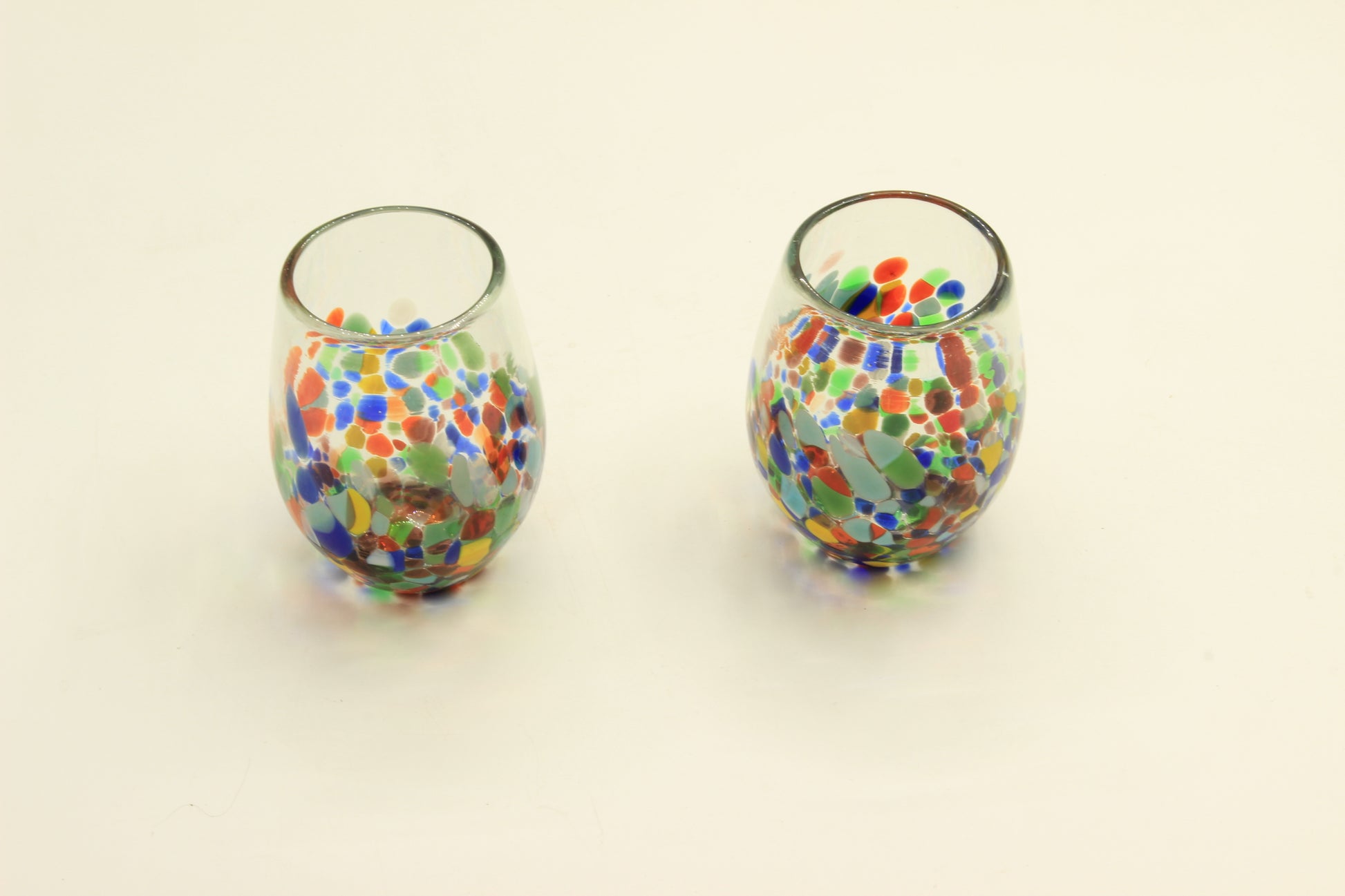 Beautiful multicolor blown glass set. Only compared with the Italian blown glass techniques from Murano, the blown glass quality from Tlaquepaque in Mexico is from the best of its kind in the world. Every artist has dedicated their lifetime to master this technique, and as a result of generations of perfectioning said technique, the artists produce some of the best blown glass pieces in the world.