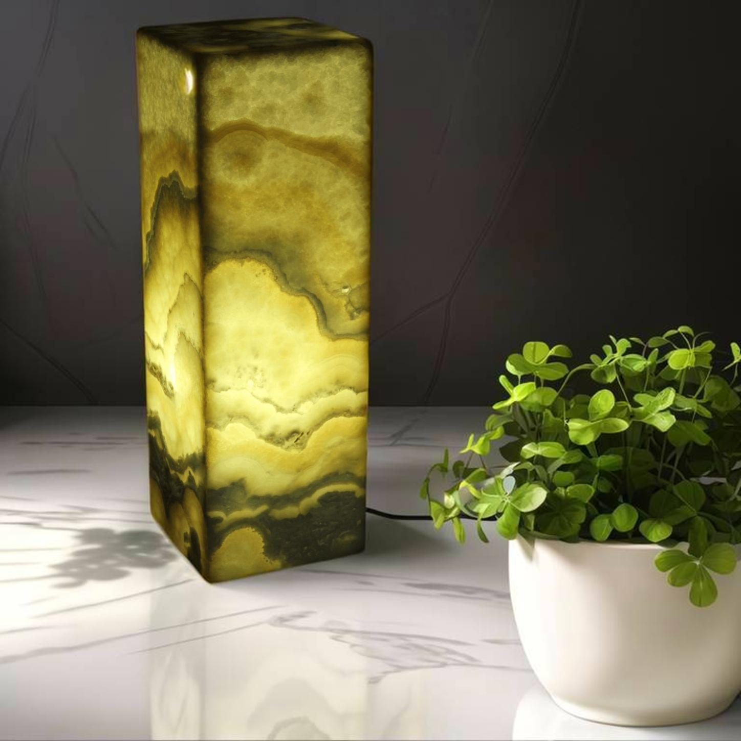Beautiful white and beige cream handcrafted onyx decorative lamp. This precious stone has been carefully crafted for millions of years by the artisans that are our Mexican volcanoes. Each piece is unique in its nature. No extracted stone is the same as another. Our Mexican artists make sure to pick the most unique samples from our volcanic deposits, and craft the most beautiful pieces of art by using the stone's magnificent translucent properties.