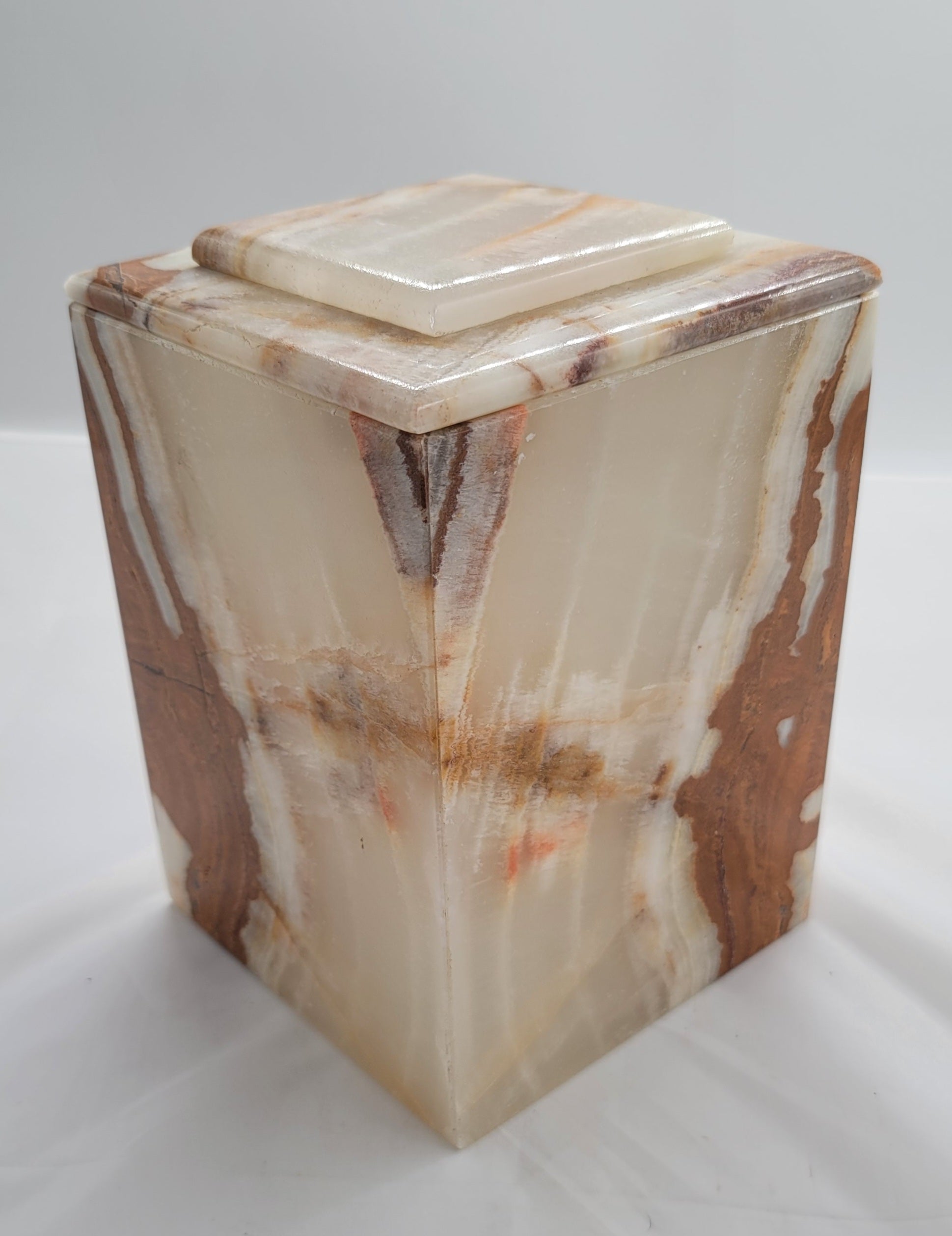 Beautiful beige handcrafted onyx container for your loved ones. This precious stone has been carefully crafted for millions of years by the artisans that are our Mexican volcanoes, Each piece is unique in its nature. No extracted stone is the same as other ones, so our Mexican artists make sure to pick the most beautiful ones from our volcanic deposits, and therefore craft some beautiful pieces of art that will change the way your home looks and feels. In the end, aren't the small things that make the difference?