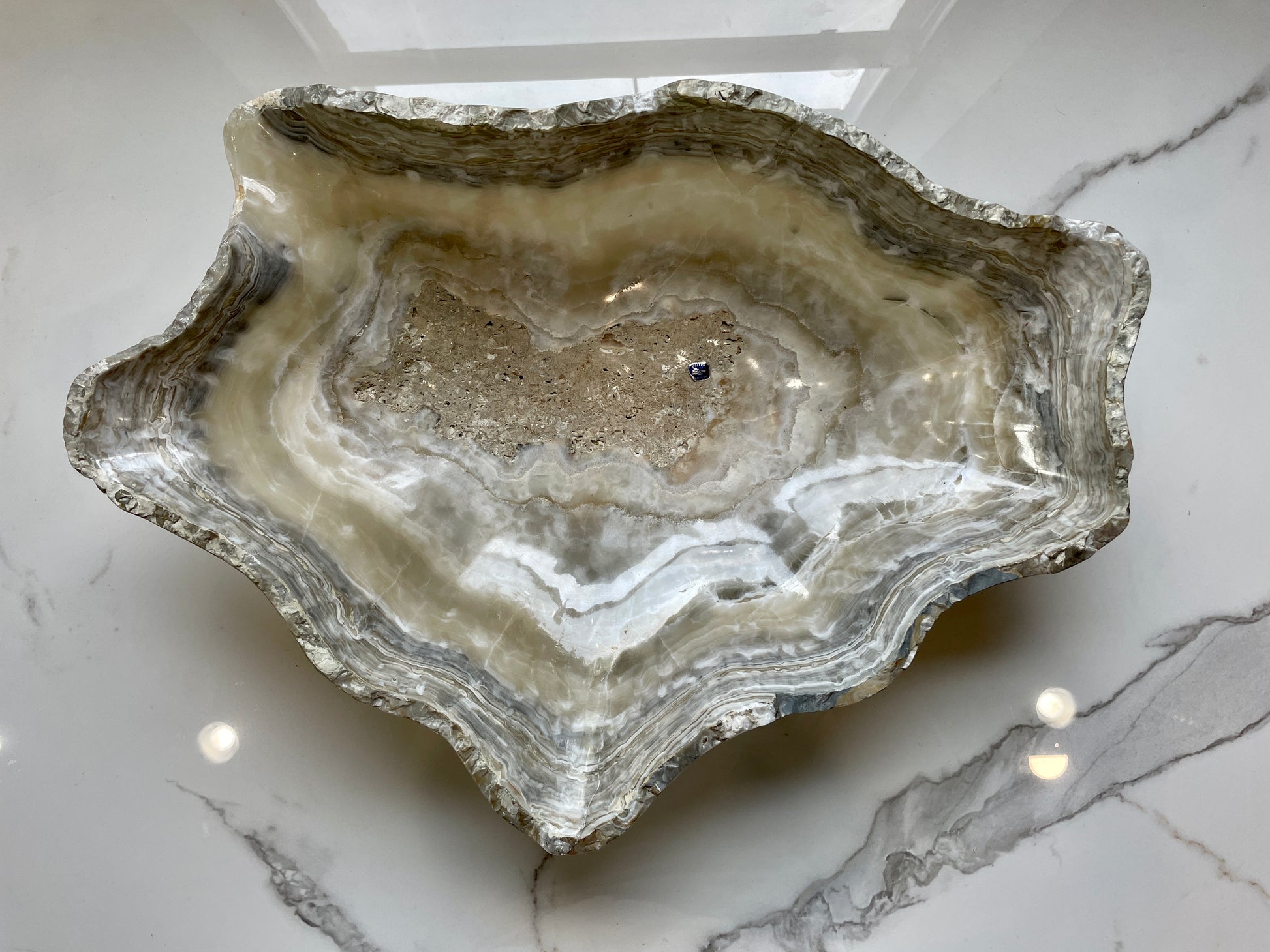 Light gray handcrafted onyx centerpiece. This precious stone has been carefully crafted for millions of years by the artisans that are our Mexican volcanoes, Each piece is unique in its nature. No extracted stone is the same as other ones, so our Mexican artists make sure to pick the most beautiful ones from our volcanic deposits, and therefore craft some beautiful pieces of art.