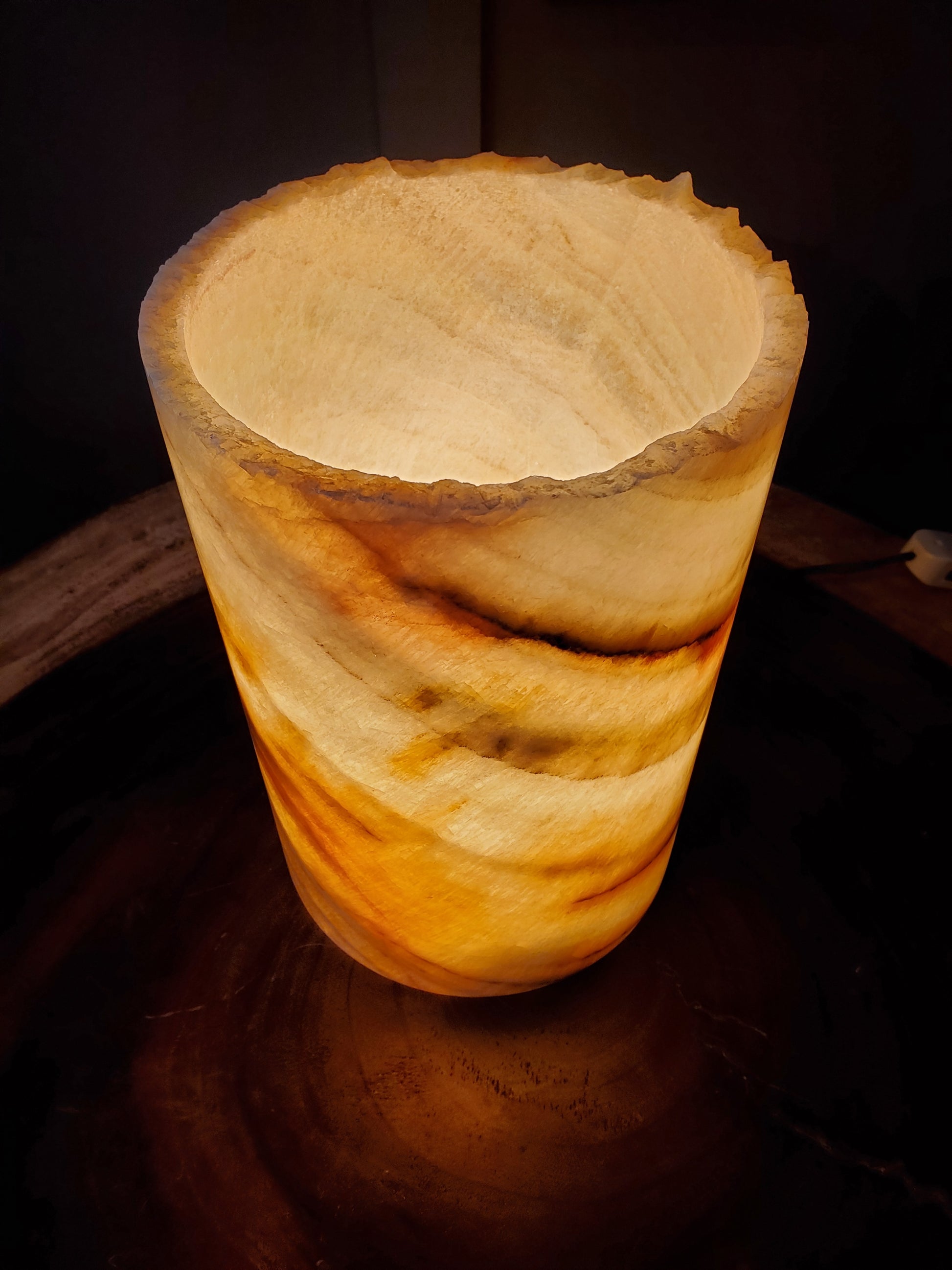 Beautiful orange, white and brown handcrafted onyx decorative lamp. This precious stone has been carefully crafted for millions of years by the artisans that are our Mexican volcanoes. Each piece is unique in its nature. No extracted stone is the same as another. Our Mexican artists make sure to pick the most beautiful samples from our volcanic deposits, and craft the most beautiful pieces of art by using the stone's magnificent translucent properties.