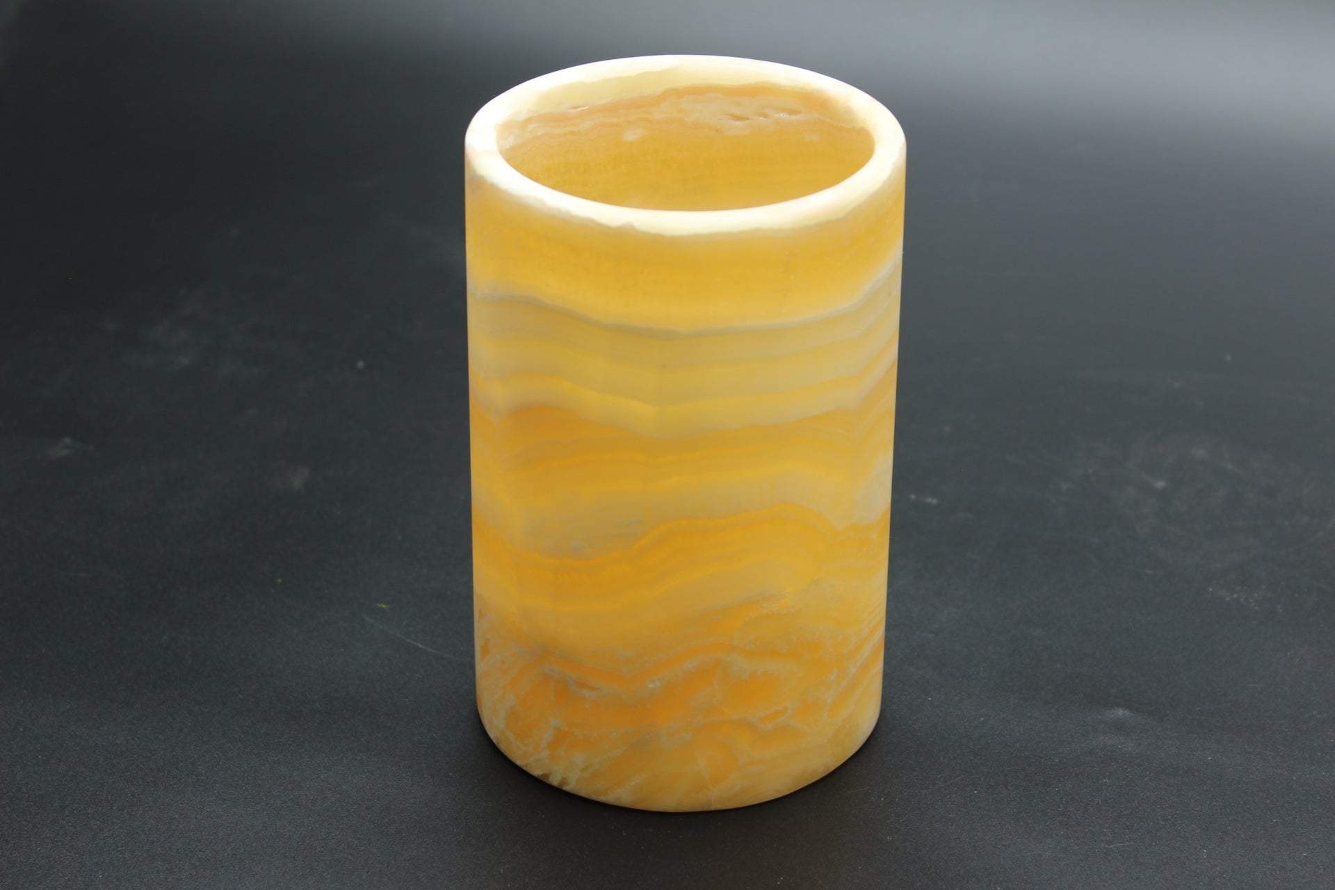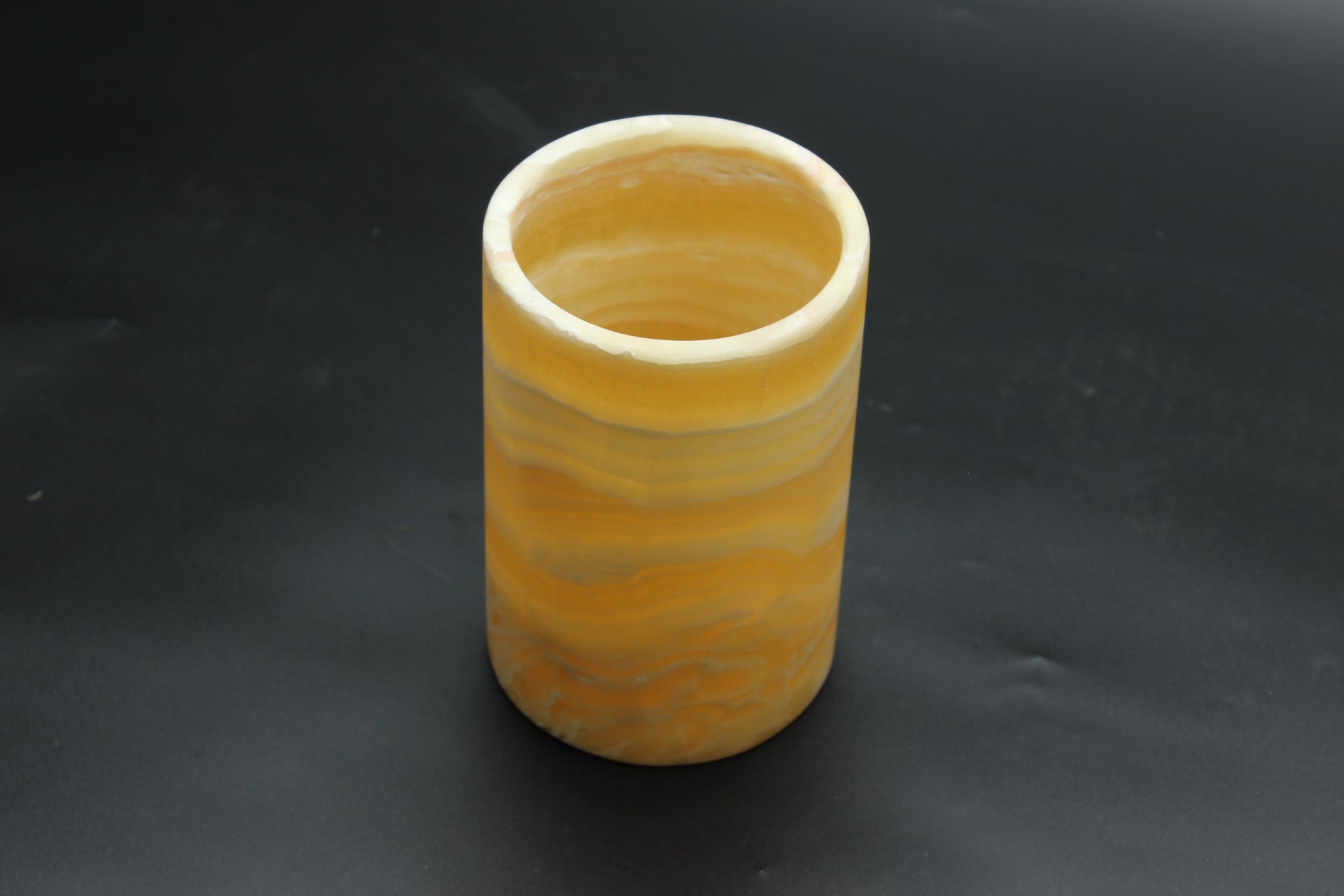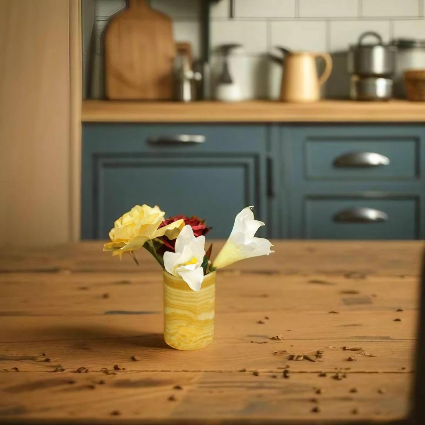 Orange and white handcrafted onyx vase. This precious stone has been carefully crafted for millions of years by the artisans that are our Mexican volcanoes. Each piece is unique in its nature. No extracted stone is the same as another. Our Mexican artists make sure to pick the most beautiful samples from our volcanic deposits, and therefore craft astonishing pieces of art.