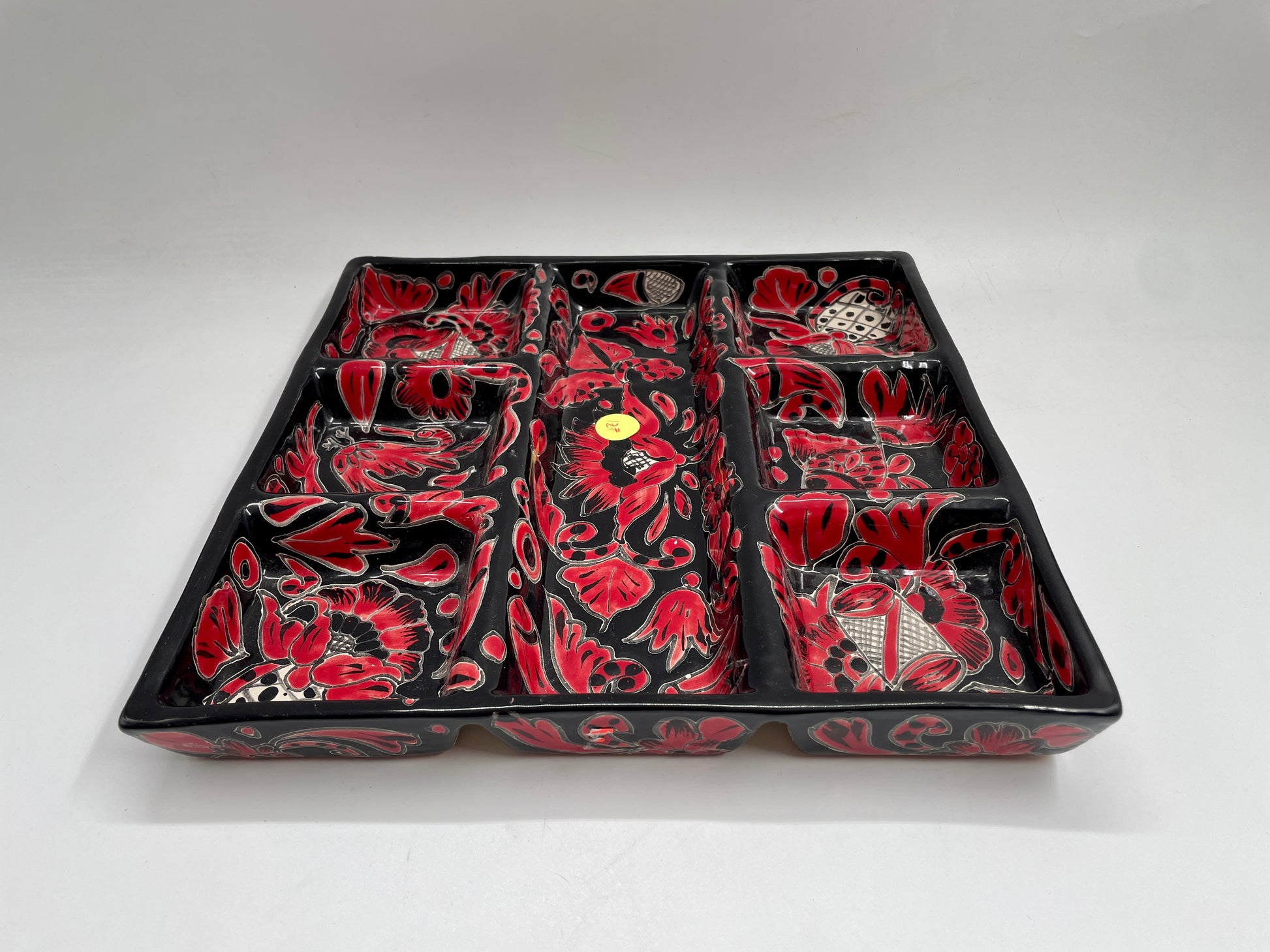 Beautiful red and black handcrafted dipping tray made from Mexican Talavera. Known for its good artisan quality, Mexican Talavera ceramic products are part of the best of the world. Thanks to centuries of a huge cultural swap coming all the way from the Arabian peninsula, and then passing through the Iberic peninsula, Mexican Talavera artists have perfected and achieved a unique method that yields some fascinating and beautiful designs that will elevate the perception of your home.