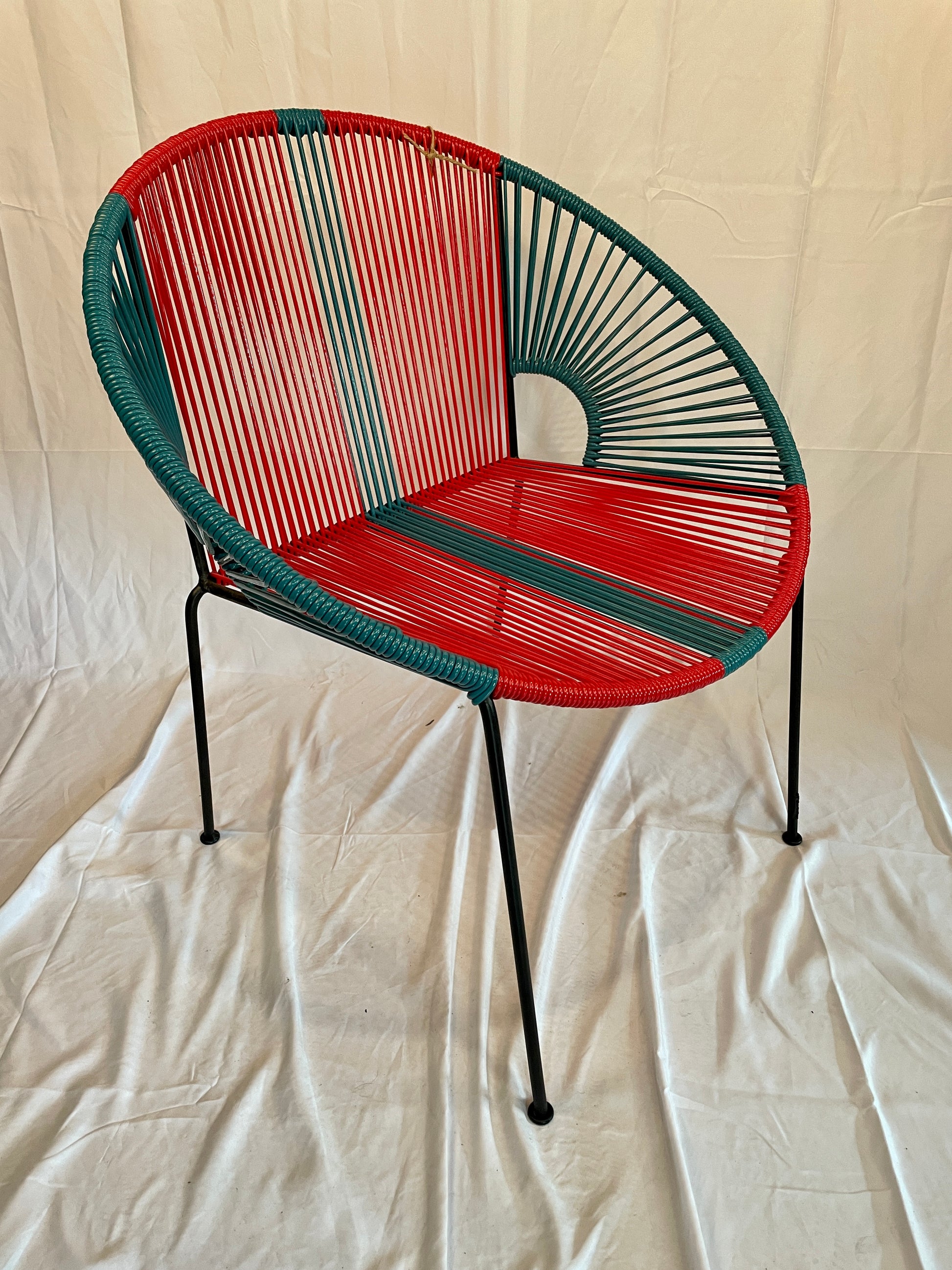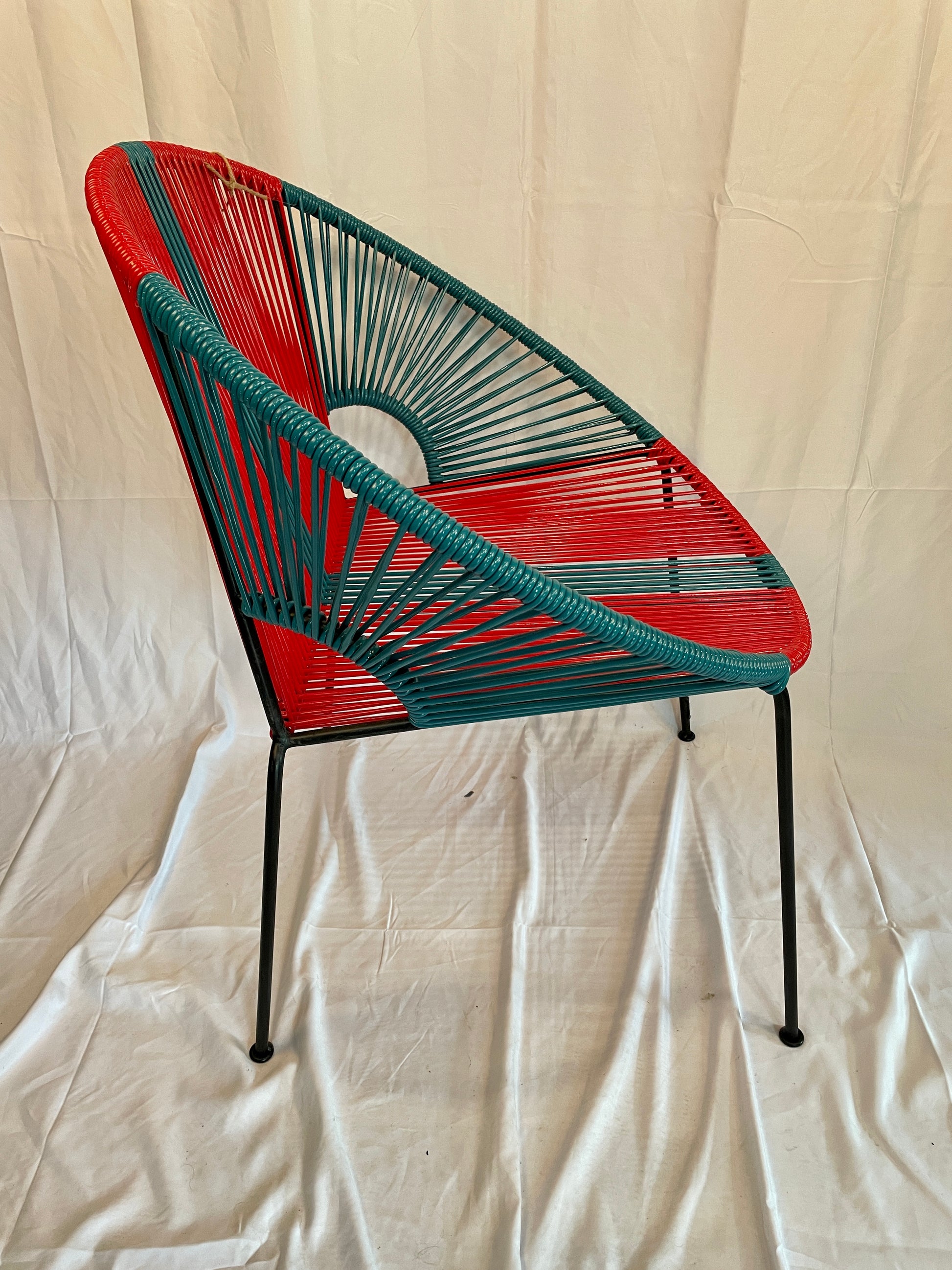 Beautiful red and blue handcrafted Acapulco styled Fable chair perfect for outdoors and indoors. Our beautiful collection of Acapulco styled furniture is designed to brighten the colors in your home, as well as introduce your home into the world of recycled material furniture and stylish decor.