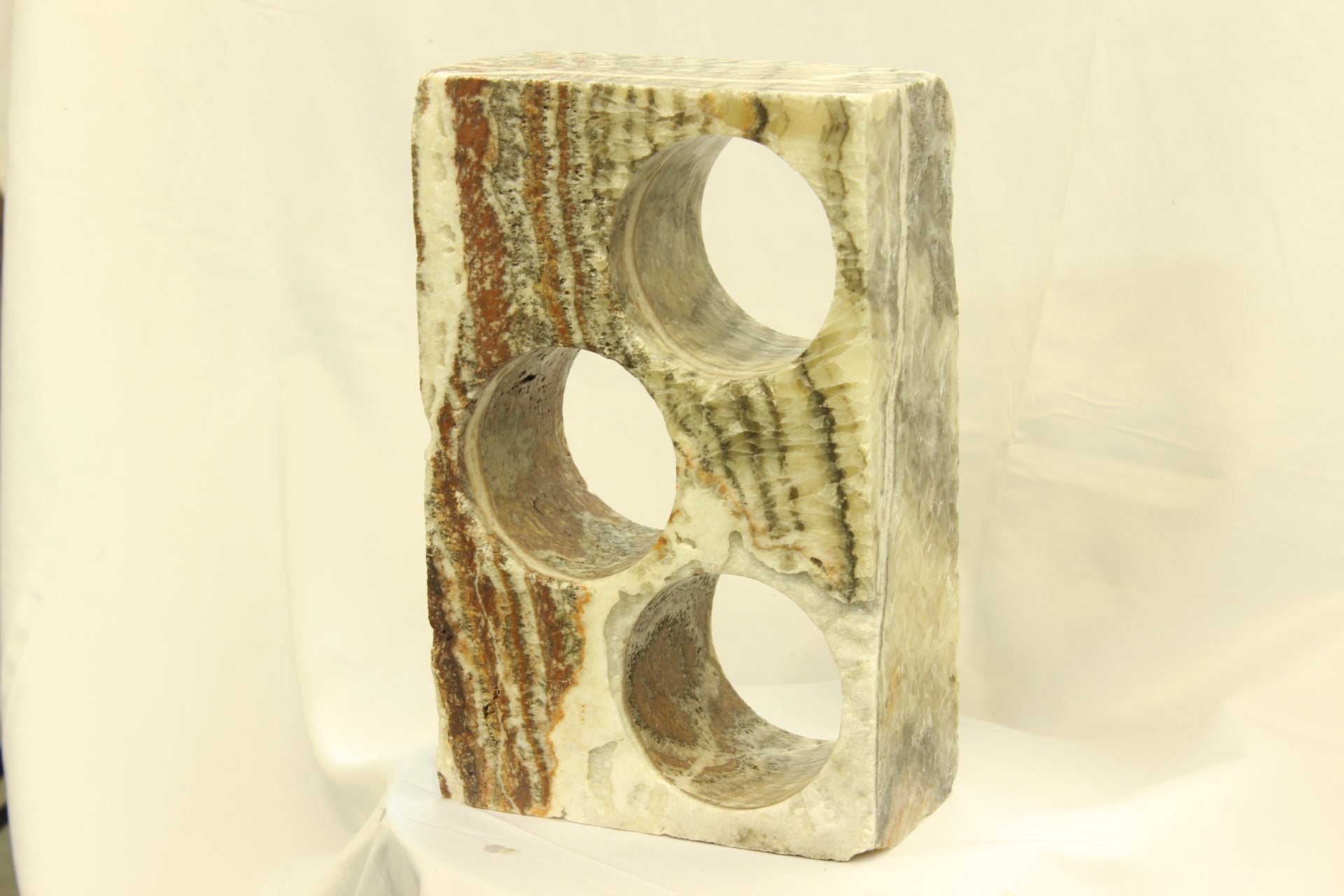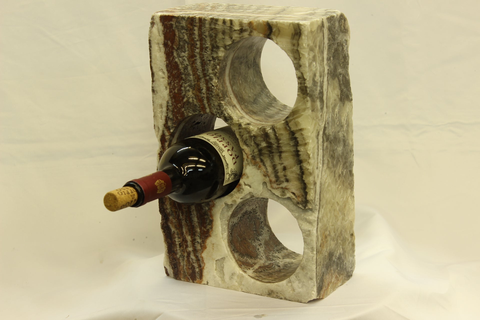 Beautiful beige, red & black handcrafted decorative 3 bottle onyx wine rack. Traditionally called 'cavas' in Mexico, this piece was hand-selected and imported from MX.