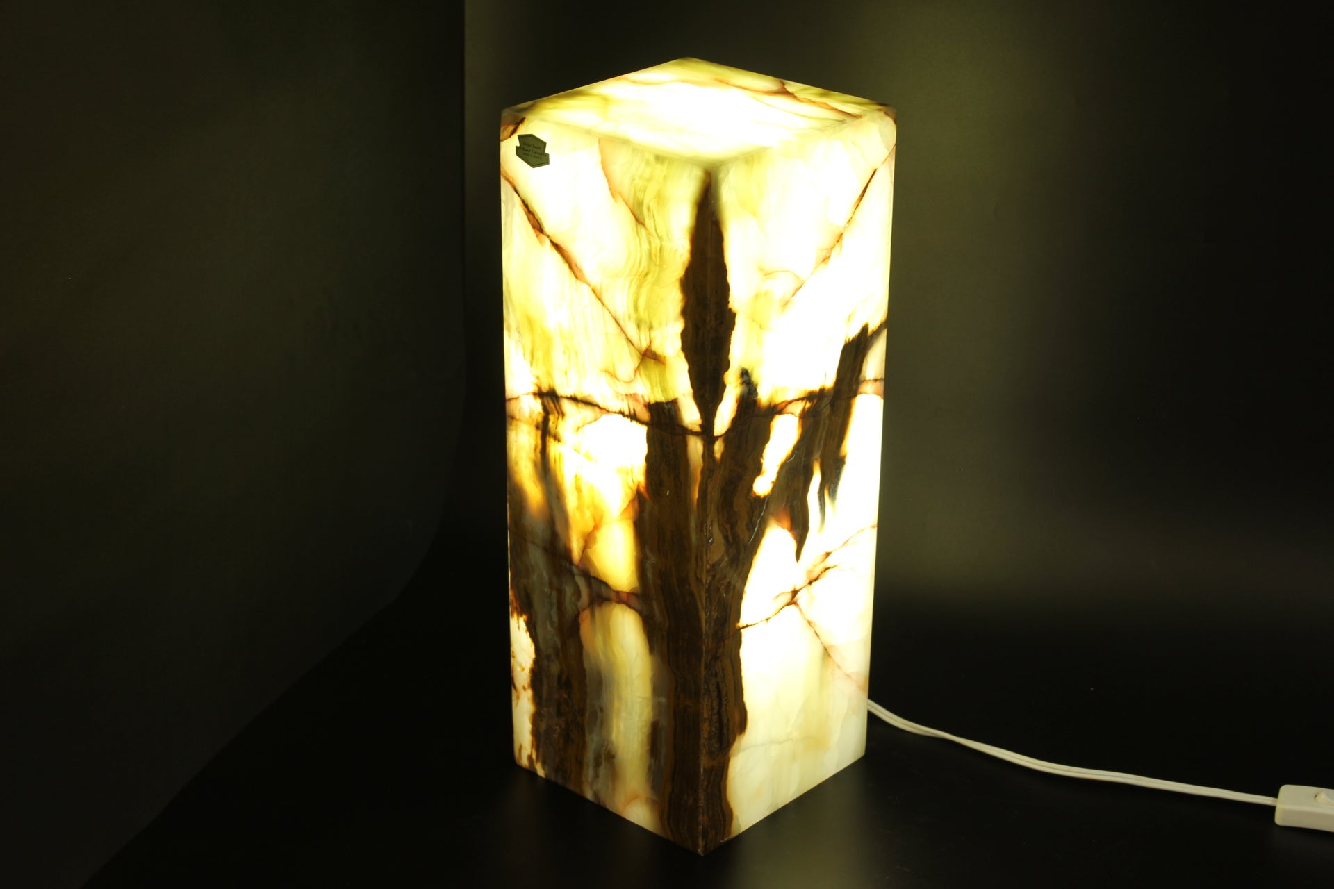 Beautiful green, brown, beige and white handcrafted onyx decorative lamp. This precious stone has been carefully crafted for millions of years by the artisans that are our Mexican volcanoes. Each piece is unique in its nature. No extracted stone is the same as another. Our Mexican artists make sure to pick the most unique samples from our volcanic deposits, and craft the most beautiful pieces of art by using the stone's magnificent translucent properties.